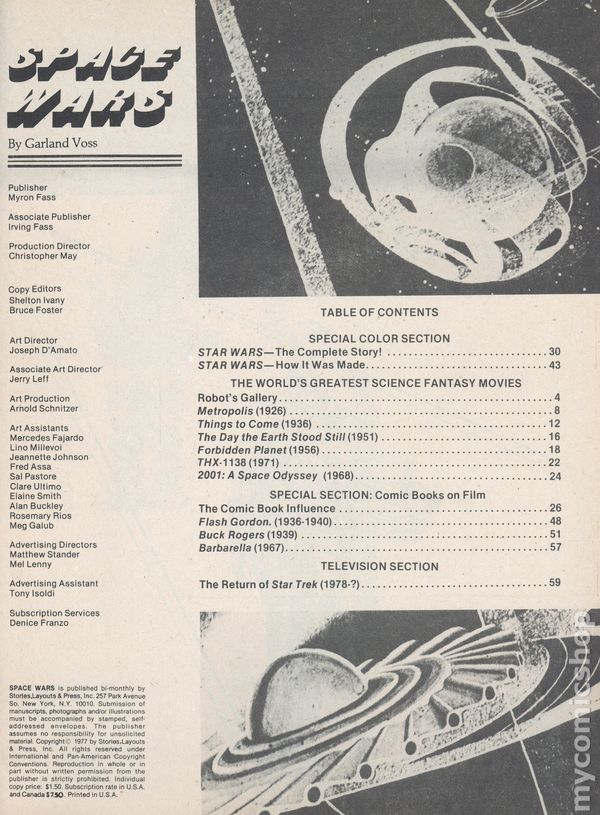 Includes the following: Star Wars—The Complete Story, Star Wars—How Was it Made, The World's Greatest Science Fiction Movies (Metropolis, Things to Come, The Day the Earth Stood Still, Forbidden Planet, THX-1138, and 2001), Comic Books on Film The Comic Book Influence (Flash Gordon, Buck Rogers, and Barbarella), and The Return of Star Trek 1978-?. 66 pgs. Cover price $1.50.