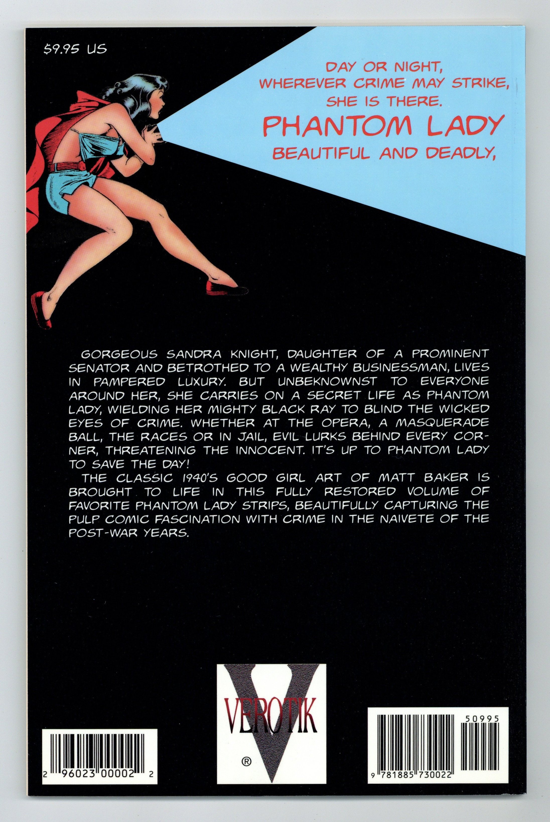 Starts Apr 20 Cover by Adam Hughes. Collects stories from Phantom Lady (1947-1949 1st Series) #14-17 and All-Top Comics (1945-1949) #9 and 12. Art by Matt Baker and Adam Hughes. This collection of Phantom Lady stories would cost you nearly $5,000 on the Golden Age back-issue market. Verotik is offering this full-color square bound volume, including three new pieces of Adam Hughes art. Softcover, 64 pages, full color. Cover price $9.95.