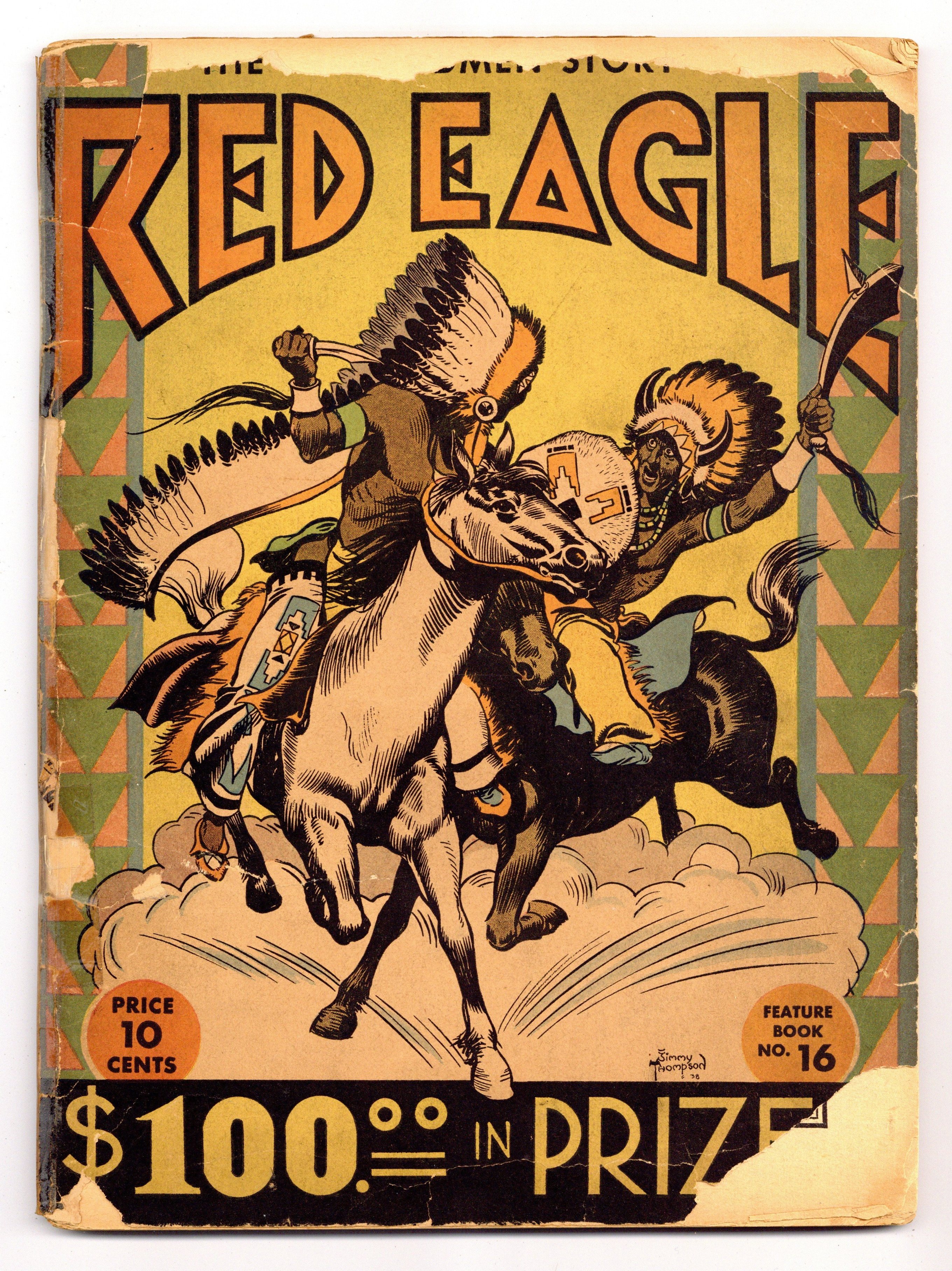 Ends Mar 23 9:16 PM CST Bid History 4 bids Current Bid $7 Your Secret Max Bid If you'd like to bid, please log in or register. Stories, art and cover by Jimmy Thompson. Pioneering comics publisher David McKay's Feature Book was the first US comic book to devote complete issues to a single character. This issue presents a heroic Native American character, Red Eagle, along with features on Native culture as it was understood in 1938. The comic doubled as a coloring book, and the center spread features two pages of text-free art, originally intended as part of a mail-in coloring contest. Red Eagle; How the False-Faces Began; How to Make Indian Beadwork; How to Make An Indian Bow. 9-in. x 12-in., 72 pages, B&W. Cover price $0.10.