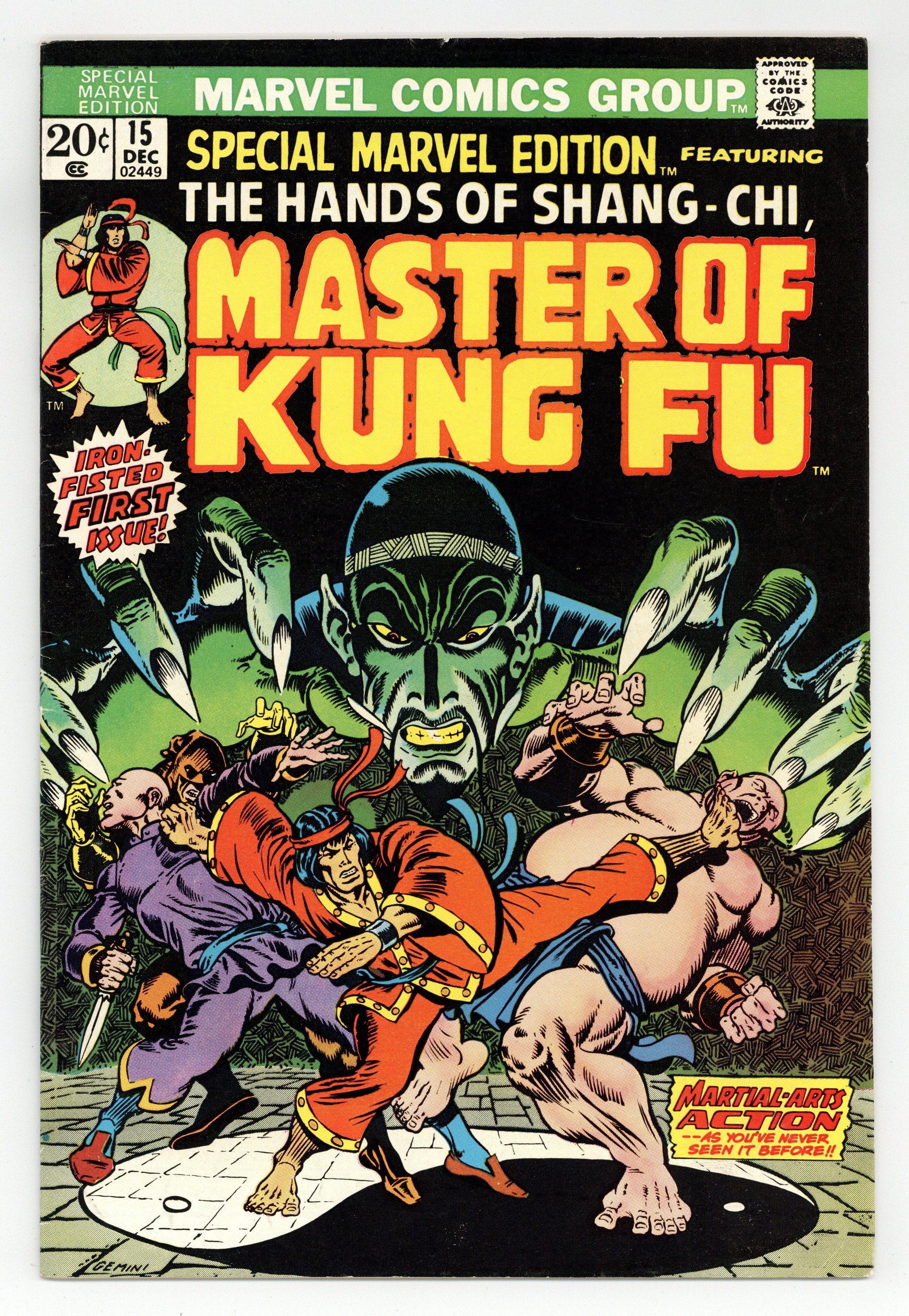 Starts Apr 4 Written by Steve Englehart and Jim Starlin. Art and cover by Jim Starlin and Al Milgrom. Shang Chi, making his first appearance, is a master of martial arts and the son of Fu Manchu, a Chinese mandarin and scientist. Fu Manchu sends Shang Chi to England in order to assassinate the evil Dr. Petrie for the common good. Shang Chi reluctantly agrees, but after the deed is done he is confronted by Sir Denis Nayland Smith, a former British intelligence officer who tells him the truth about Fu Manchu; that he is a nearly immortal evil mastermind. Shang Chi travels back to his father's secret lair in New York and renounces him. Text articles by Roy Thomas and Englehart about the creation of Shang-Chi. Ad for Astonishing Tales #21. A brief obituary for Syd Shores. Ad for the Marvel fan club FOOM (Friends of Ol' Marvel). 36 pages, full color. $0.20. Cover price $0.20.