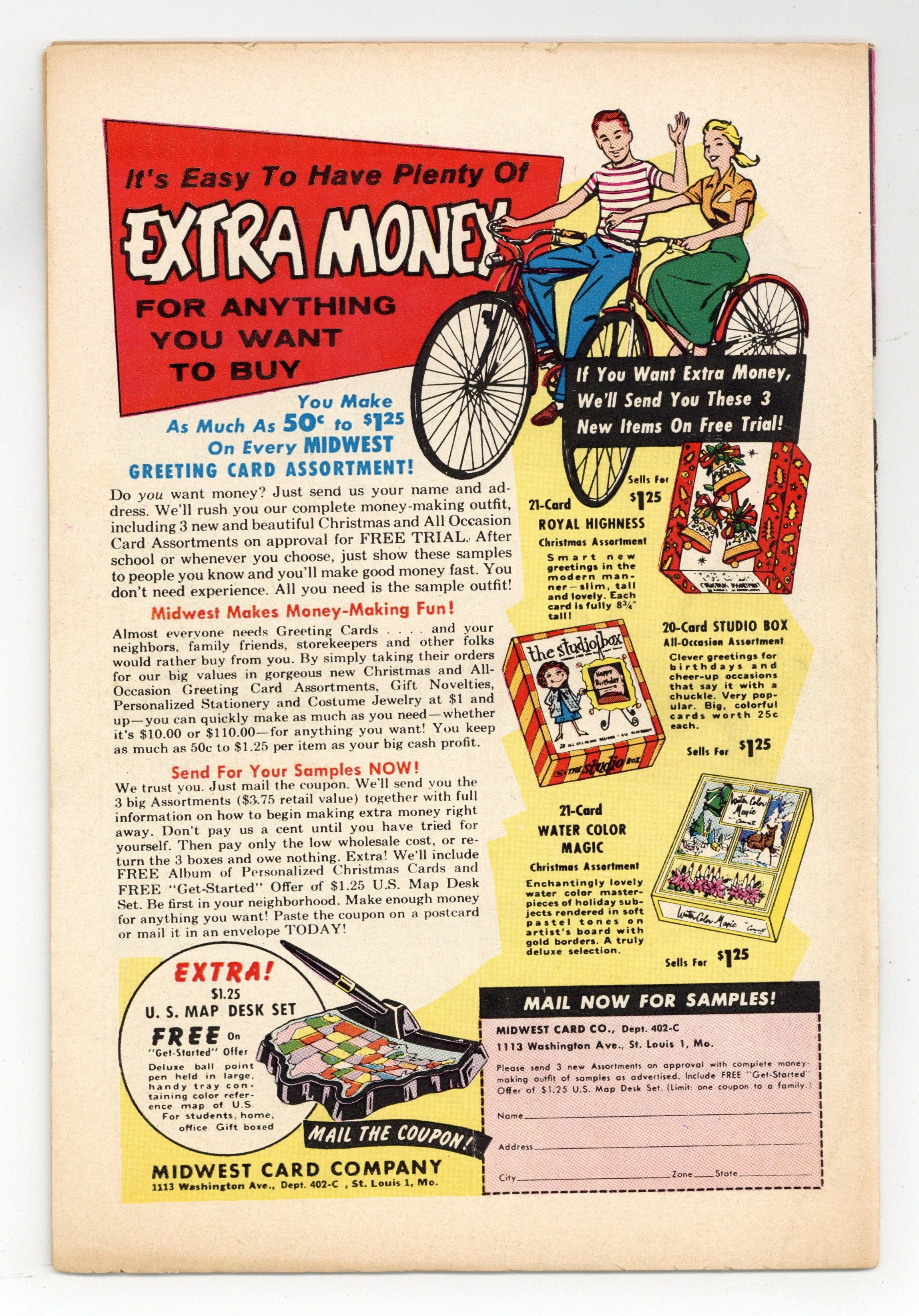 Starts Apr 4 Painted cover by Clarence Doore. Stories and art by Dan De Carlo, Rudy Lapick, Vic Martin, and Ernie Schroeder. Neither a tie-in with the later toy line/cartoon nor a grim war comic, this first-gen GI Joe focused on lighthearted tales of military life. The Yardbirds, featuring Pvts. Windy and Whitey, was straight-up comedy of the Beetle Bailey/Sad Sack variety. "Ready-Money Reilly" thinks his pal's new comic strip is the perfect thing to help sell his base newspaper, but no one expects the strip to become a national craze. Pvt. Windy tries to sneak away from a training exercise to go on a date, in a story by future Archie legend Dan De Carlo. Joe tells some Korean kids another fairy tale, a wacky military-themed version of Jack and the Beanstalk with art by Mike Suchorsky. Painted cover with bondage elements by Clarence Doore. Army Chuckles; Johnny-Come-Lately; The Yardbirds: The Great Escape; Private Jokes; Adventures in Wonderland; Dear Gertrude; Khaki Humor; Beautiful Benny of Company B. 32 pages, Full Color. Cover price $0.10.