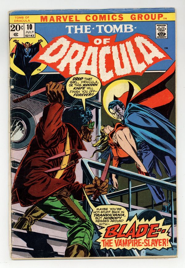 Starts Apr 4 "His Name is Blade!" Written by Marv Wolfman. Art by Gene Colan and Jacki Abel. Half-human, half-vampire, all attitude! His name is Blade and he's here to destroy Dracula once and for all. 32 pages, FC. NOTE: 1st appearance of Blade the Vampire Slayer. Cover price $0.20.