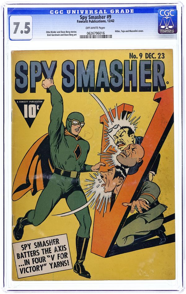 Stories and art by Otto Binder, Alex Blum and Al Camy. One of Fawcett's most popular superheroes, Spy Smasher fights saboteurs, fifth columnists, Quislings and collaborators during WWII. Enemy scientists create a new Ice Age in Florida, and Spy Smasher seeks a way to thaw out the Floridians. Spy Smasher must travel to Tokyo to free the girl in the glass coffin. The mysterious Mr. Gloom is giving away cash for free, but Spy Smasher realizes the money is poisoned with Black Plague. The Blizzard Blitzkrieg; The Amateur Dictator; Sir Butch; Spy Smasher in Tokyo; Deadly Decoys; Thirteen Steps to Doom. 64 pages, Full Color. Cover price $0.10.