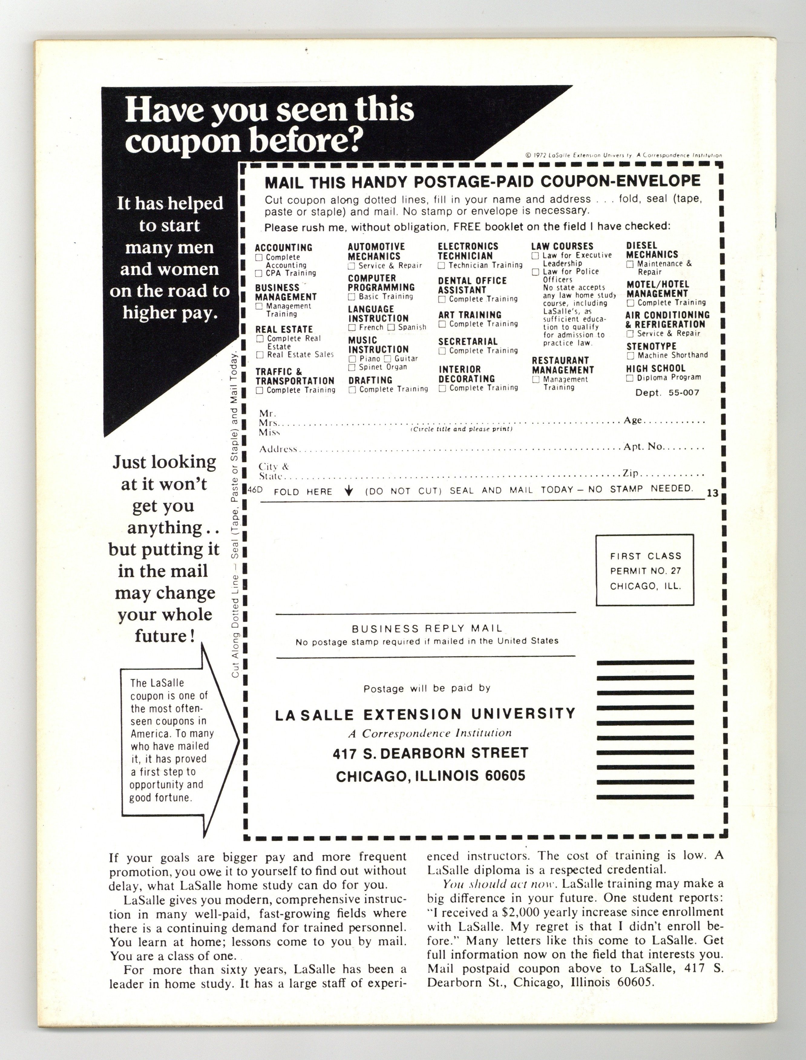 Starts Jan 3 100-page giant. New story: the Marvel Family stars in "The Evil Return of the Monster Society." Script by Denny O'Neil, art by Kurt Schaffenberger. Reprints: "The Prophetic Book" (from Captain Marvel Adventures 57 in 1946; art by Pete Costanza), Captain Marvel Jr. in "The Man Who Lived History" (from Captain Marvel Jr. 83 in 1949), "Mr. Tawny's Fight for Fame" (from CMA 126 in 1951; art by C.C. Beck), Mary Marvel in "Curse of the Books" (from Mary Marvel 2 in 1946; art by Jack Binder), "The Magic Mix-Up" (from CMA 102 in 1949; pencils by Beck, inks by Costanza), and the Marvel Family in "The World Wrecker" (from Marvel Family 86 in 1953; art by Kurt Schaffenberger). Bob Oksner cover. Cover price $0.60.