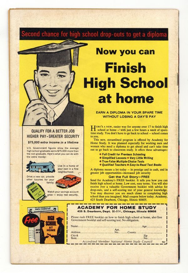 Starts Jan 3 Cover art by Win Mortimer. The Secret of the Golden Coins, pencils by John Sikela, inks by Ed Dobrotka; When Clark and his friends find a pirate treasure chest filled with gold coins with Superboy's picture on them, Superboy flies back to the past to find out how that happened. Clark Kent's Terrible Report Card!, pencils by Curt Swan, inks by John Fischetti; Clark deliberately gets assigned to the "problem kids" class. Play Ball--Superboy's Workshop activity page. Nostradamus biography. Peg humor two-pager by Henry Boltinoff. Superboy's Class Reunion!, pencils by Curt Swan, inks by John Fischetti; Clark visits a reunion of some of his old high school pals; Superboy appears in flashback only. 52 Pages, Full Color. Cover price $0.10.