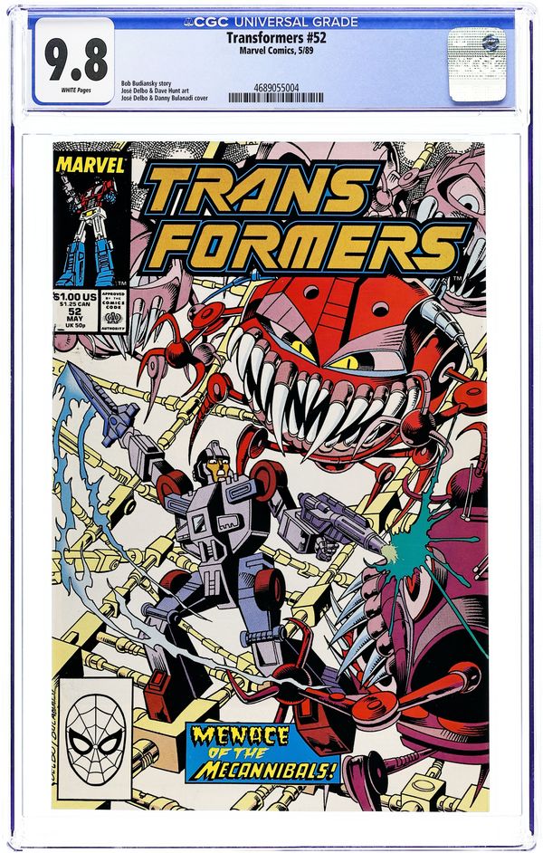 Cloudburst and Landmine, disguised as humans, are at the Grand Central Space Station trying to obtain microchips to repair battle damaged Autobots. But mechanical life forms are not welcome aboard the station and that leads the pair into a lot of trouble and adventure in Guess Who the Mecannibals are Having for Dinner? Script by Bob Budiansky and art by Jose Delbo & Dave Hunt. Cover by Jose Delbo and Danny Bulanadi. Cover price $1.00.