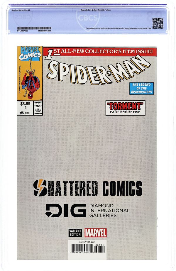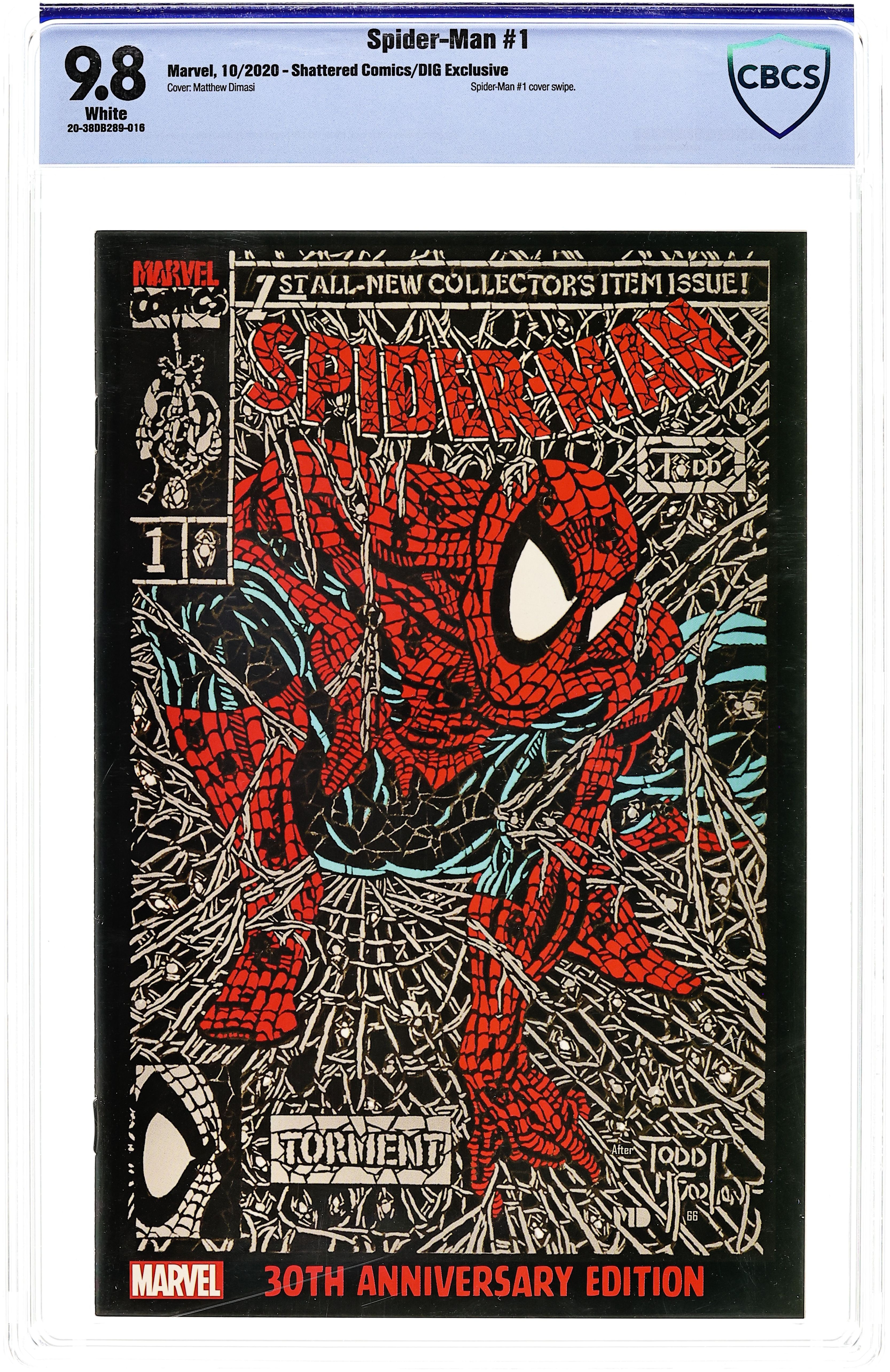 Shattered Comics exclusive 30th anniversary variant cover by Matt Dimasi. Story and Art by Todd McFarlane. Celebrating the 30th Anniversary of Spider-Man #1 In 1990, superstar AMAZING SPIDER-MAN artist Todd McFarlane wanted to stretch his creative muscles as a writer - and the result was a brand-new SPIDER-MAN book that needed no superlative! Boasting one of the most famous comic-book covers ever drawn, the record-breaking first issue sold over two million copies - and inside, McFarlane's Spider-Man looked more extraordinary than ever. But why has Spidey's classic foe the Lizard begun a brutal killing spree? As the pounding drums spell doom, the torment is only beginning for Spider-Man and Dr. Curt Connors! It's one of the all-time great Marvel comic books, boldly re-presented in its original form, ads and all! Reprinting SPIDER-MAN (1990) #1. 32 pages, full color. Rated T Cover price $3.99.