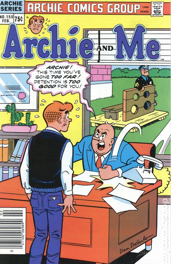 Canadian Edition. Cover art by Stan Goldberg. The Last Straw, script by Frank Doyle, pencils by Stan Goldberg, inks by Rudy Lapick; Mr. Weatherbee tries to ignore the temptations of food. The Shut-In; Archie puts a new lock on Mr. Weatherbee's door. Shower Power; When Mr. Weatherbee's hot water heater breaks, Archie suggests he take a shower at the school. Forget Me Not; Disaster is in store for Mr. Weatherbee when he runs into Archie at the mall. 36 pgs. $0.75. Web Scratchpad : 161 issues in series. Cover price $0.75.