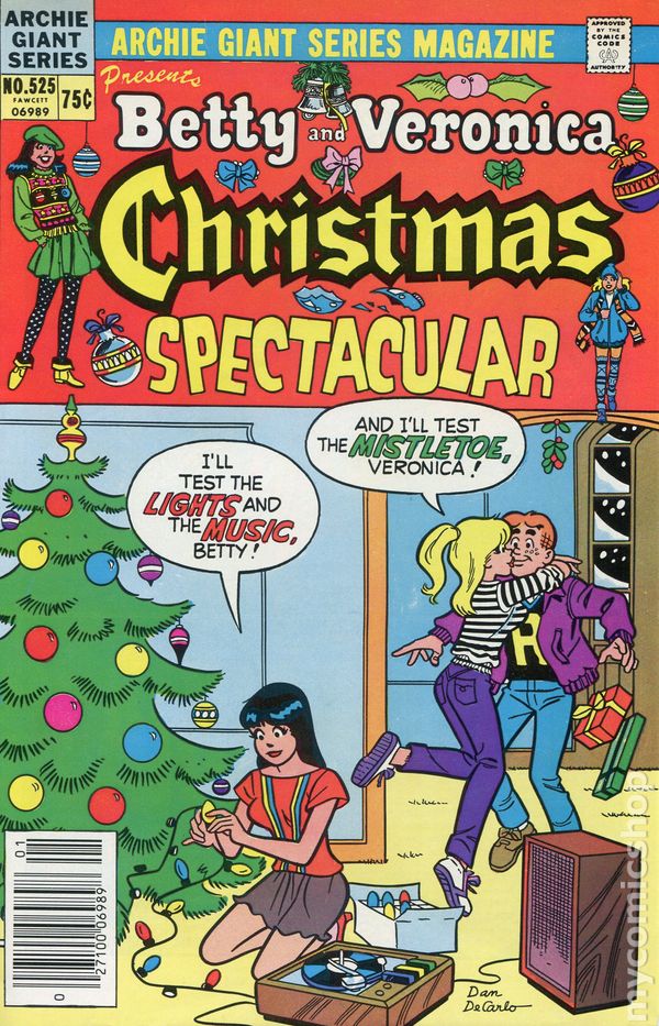 Canadian Price Variant. 75¢ cover price. Betty and Veronica Christmas Spectacular. Cover art by Dan DeCarlo. "Lip Service," script by Frank Doyle, art by Stan Goldberg; Veronica uses mistletoe to kiss Archie at different places in her house. Veronica-Yule Return! activity page. "The Scary Season"; Betty's gloom around the holidays is spreading to her friends. "The Rise and Fall," script by George Gladir, pencils by Dan DeCarlo Jr., inks by Jim DeCarlo; Gaston bakes a giant Christmas cake for the community center that doesn't fit through the door. Betty's Holiday Fashions illustration, pencils by Dan DeCarlo. "Cold Christmas"; Betty and Veronica try to convince C.D. Marley, a Scrooge, of the good things about Christmas. 36 pages, full color. Cover price $0.75.