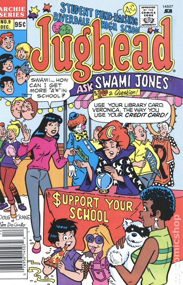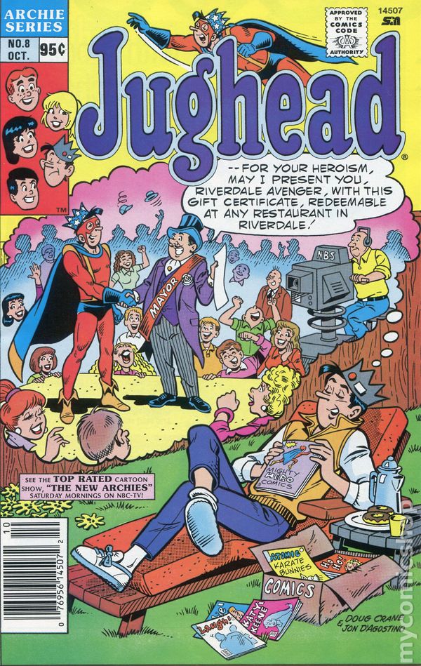 Canadian price variant. 95ยข cover price. Cover pencils by Doug Crane, inks by Jon D'Agostino. "Comics," script by Rod Ollerenshaw, pencils by Doug Crane, inks by Mike Esposito; Veronica pokes fun at Jughead's love of comics, and his fantasy of being the Riverdale Avengerโฆuntil she realizes how much money can be made from collecting them. "Surprise Ending!" Sunkist with Archie and His Friends. "Truly Trendy" half-page story; Hilda wears a very old-fashioned swimsuit to the beach. "A Public Service Message from Archie Comics" AIDS awareness ad with the Archie gang. "Sign Bored," script by H. A. Smith, pencils by Doug Crane, inks by Hy Eisman; Jughead takes Hot Dog for a walk and Hot Dog makes comments on all the signs they see. "The Long and the Short," script by Frank Doyle, pencils by Doug Crane, inks by Mike Esposito; Jughead gets on his friends' nerves by correcting their vocabulary to smaller synonymous words or phrases. "Lets Do the FruitSlush Mush!" ad with the The Archies. Archie's Club News. "Dating Dilemma," script by Nate Butler, pencils by Doug Crane, inks by Mike Esposito; Jughead's childhood friend Joani has moved back to town, and Jughead takes a job to make some money to take her to supper. "Bedrockin' Shakedown" Pebbles Cereal ad with The Flintstones. 36 pages, full color. Cover price $0.95.