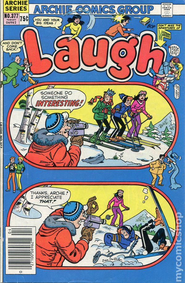 Canadian Price Variant. First $1.20 cover price. Cover pencils by Dan DeCarlo, inks by Rudy Lapick. "Handy Man," script by Frank Doyle, pencils by Doug Crane, inks by Scott McRae; Not only is the man a skilled food expert, but Jughead also dazzles everyone with his remarkable juggling skills; his obsession with juggling impresses Mr. Lodge. "To an Antique Freak it's an Obsolete Treat," script by Hal Smith, pencils by Doug Crane, inks by Tom Moore; In order to clean out the family garage, Jughead holds a garage sale. "Color Me Green," script by Frank Doyle, pencils by Doug Crane, inks by Scott McRae; Debbie and Joani ask Jughead which one of them he likes best. "Jughead's Family Tree" cartoon, script and art by Rod Ollerenshaw; Two more examples of Jughead's humorous relatives. "Invitation for Disaster" half-page story with Sabrina, script by George Gladir, pencils by Stan Goldberg, inks by Rod Ollerenshaw; Ambrose throws a party. "The Hot Dog," script by George Gladir, pencils by Doug Crane, inks by Scott McRae; Jughead enters a free-style skiing event by mistake. 36 pgs., full color. Cover price $1.20.