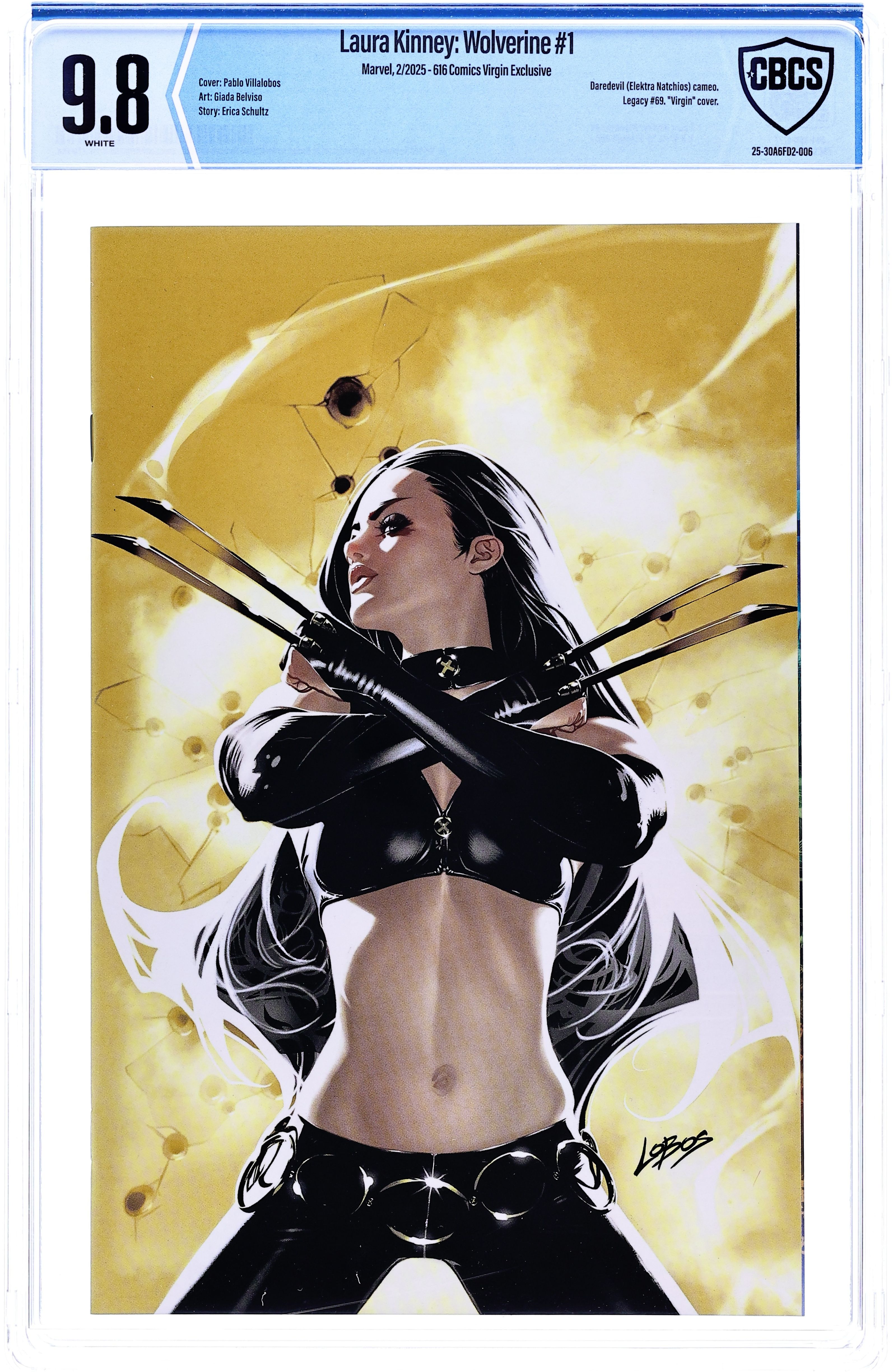 The 616 Comics Exclusive Virgin Cover by Pablo Villalobos. Written by Erica Schultz. Art by Giada Belviso. THE ULTIMATE MUTANT DEFENSE! WOLVERINE takes the fight to those who stand as enemies of mutantkind! LAURA KINNEY was bred to be the ultimate assassin as X-23. She's long left that life behind, but as she encounters mutants being forced to use their powers against their will, WOLVERINE takes it upon herself to right these wrongs - no matter who stands in her way! Dynamic scripter Erica Schultz (HALLOWS' EVE, X-23: DEADLY REGENESIS) and rising-star artist Giada Belviso (BLOOD HUNTERS, MS. MARVEL ANNUAL) bring Wolverine on her first mission abroad in the From the Ashes era, as Laura takes the fight to mutant oppressors wherever they may hide! 32 page, full color. Rated T+ Cover price $4.99.