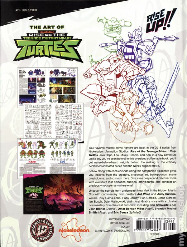 1st printing. Text by Colin Stein. Foreword by Andy Suriano and Ant Ward. Explore the bold and dynamic world of the celebrated animated series with this comprehensive art book that showcases the unique artistic vision behind the show. From preproduction sketches to final episode designs, this book offers fans an inside look at the creative process that brought Rise of the Teenage Mutant Ninja Turtles to life. Discover concept art, character development, and background designs that capture the series distinct style. Featuring exclusive behind-the-scenes commentary from the cast and crew, and the evolution of iconic characters like Leonardo, Raphael, Donatello, Michelangelo, and April, this collection celebrates the innovation that made the show a standout in the franchise. Hardcover, 9 1/2-in. x 12-in., 320 pages, full color. Rated T+ Cover price $39.99.