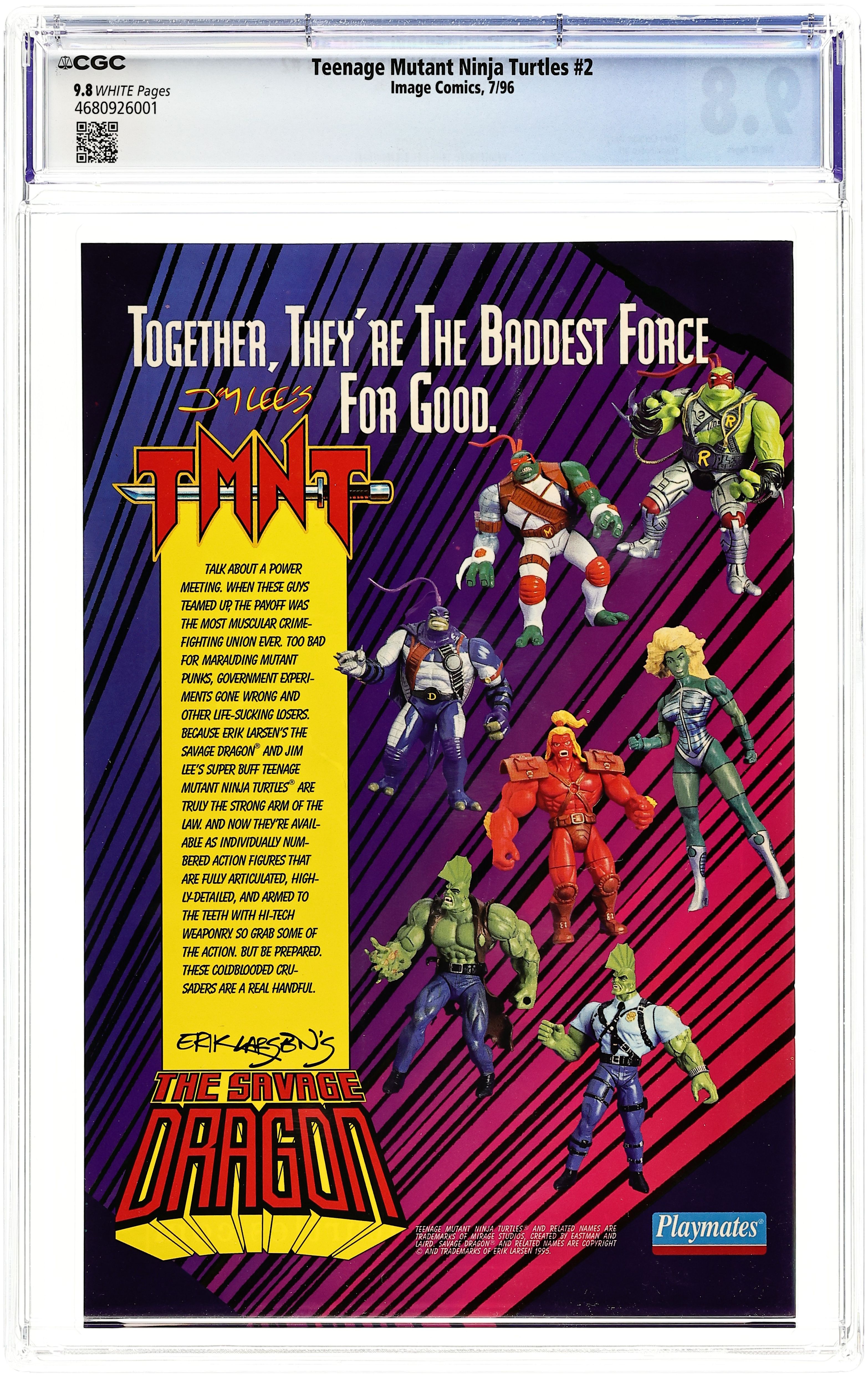 Chicago Con Exclusive. Mike, Raph, Don and Leo receive a rude welcome to the Image Universe when their sewer home is invaded by trigger-happy goons of the mysterious Warlord Komodo! Fandom's favorite rugged reptiles return to their black & white roots as bullets fly, blood flows and heads roll! These ain't the cartoons-for-kiddies Turtles. These are the hard-edged, fighting mad ninjas that took the comic world by storm--the ones you demanded! Written by Gary Carlson. Art by Frank Fosco and Erik Larsen. #1B cover by Jeff Matsuda. B/W 24 pg.