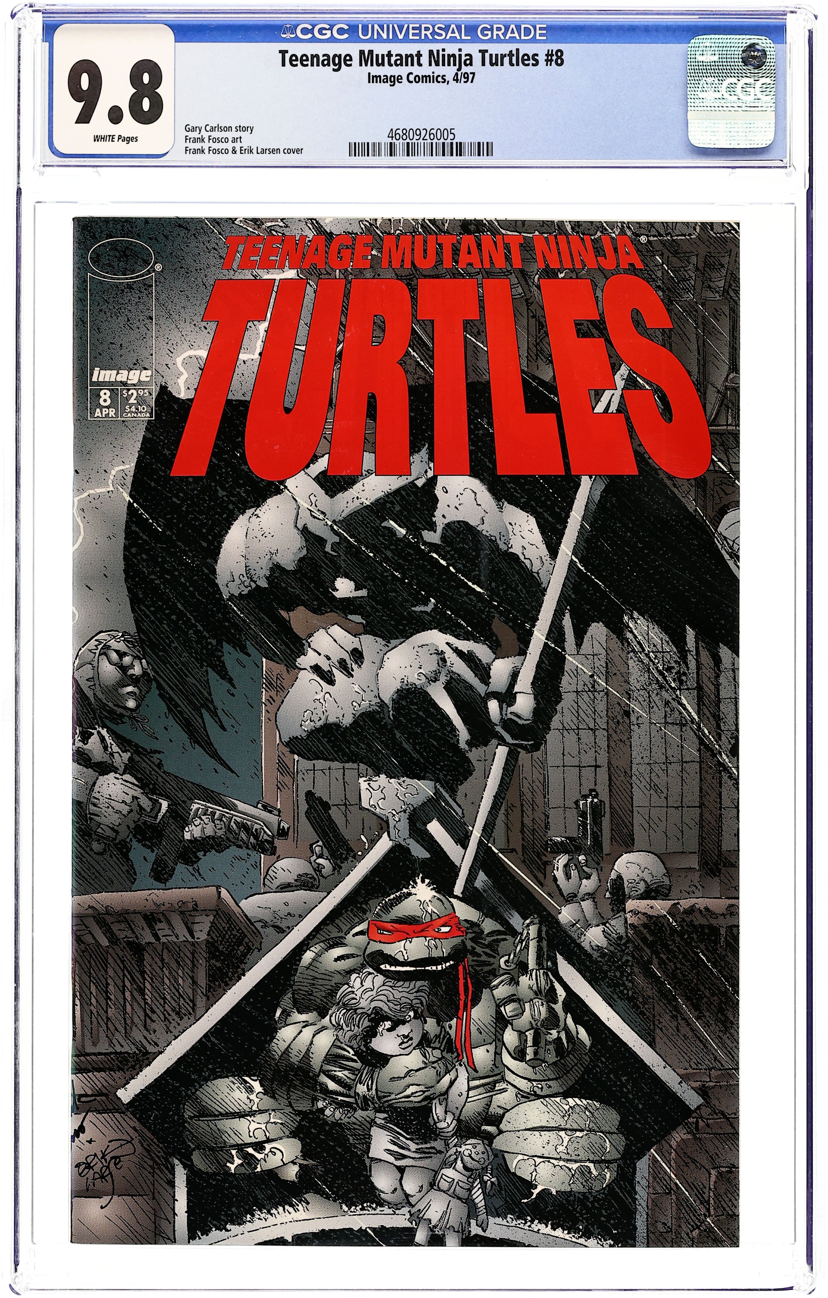 Michelangelo embarks on a suicidal raid to redeem himself and rescue Casey Jones' daughter who was kidnapped from under Mike's nose. Plus, Leonardo follows a trail of giant bat sightings across the midwest in his search for Splinter. Written by Gary Carlson. Pencils by Frank Fosco. Cover by Frank Fosco and Erik Larsen. B/W 24 pg. Cover price $2.95.