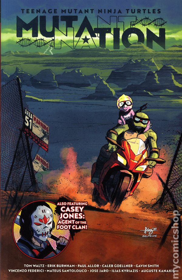 Limited 1 for 10 Retailer Incentive Variant Cover. Written by Tom Waltz, Erik Burnham. Art by Vincenzo Federici, Mateus Santolouco. Cover by Jesse Lonergan. New ongoing series! Part 1 of the Raphael flashback adventure arc Attack on Area 51! After the events of The Armageddon Game, the Teenage Mutant Ninja Turtles found themselves at a crossroads, attempting to keep their family united while individually feeling the need to break away and explore life in a world that knows about mutants. To clear his head, Raphael jumps on his motorcycle and heads west on a solo road trip with the wind at his back and no destination in mind…until a dormant enemy out for revenge on the Turtles engineers a dangerous detour to Area 51. When Raphael is held hostage with some unexpected old friends, his soul-searching quest mutates into a crisis as he brawls in the desert to keep the E.P.F.s cache of coveted technology out of the wrong hands. Will Raphael find his new purpose away from his brothers…or just more trouble than he can handle alone? Tom Waltz, the TMNT mastermind and co-writer of TMNT: The Last Ronin, returns to tell brand-new stories about everyones favorite anthropomorphic misfits with artist Vincenzo Federici. Plus, writer Erik Burnham presents a four-issue bonus backup: after the events of The Untold Destiny of the Foot Clan, can Casey Jones tolerate Karais descent into ruthlessness, or will he turn his back on the Foot? The answer ripples into the upcoming action in Jason Aarons TMNT! Each arc of Mutant Nation will feature two stories exploring different corners of the TMNT universe, easily accessible to casual fans but with ties connecting the ongoing series and Nightwatcher. Expect old favorites and new surprises! 36 pages, full color. Cover price $5.99.