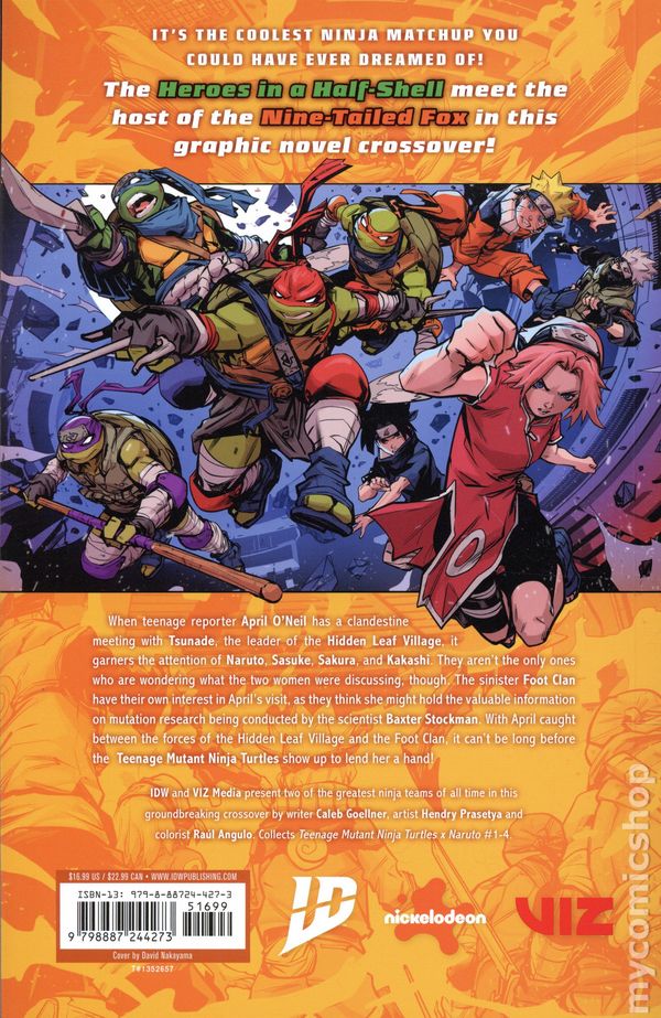 1st printing. Collects Teenage Mutant Ninja Turtles X Naruto (2024 IDW) #1-4. Written by Caleb Goellner. Art by Hendry Prasetya. Cover by Jorge Jiménez. Back Cover by Hendry Prasetya. It's the coolest ninja matchup you could have ever dreamed of! The Heroes in a Half-Shell meet the host of the Nine-Tailed Fox in this graphic novel crossover! When teenage reporter April O'Neil has a clandestine meeting with Tsunade, the leader of the Hidden Leaf Village, it garners the attention of Naruto, Sasuke, Sakura, and Kakashi. They aren't the only ones who are wondering what the two women were discussing, though. The sinister Foot Clan have their own interest in April's visit, as they think she might hold the valuable information on mutation research being conducted by the scientist Baxter Stockman. With April caught between the forces of the Hidden Leaf Village and the Foot Clan, it can't be long before the Teenage Mutant Ninja Turtles show up to lend her a hand! IDW and VIZ Media present two of the greatest ninja teams of all time in this groundbreaking crossover by writer Caleb Goellner and artist Hendry Prasetya. Softcover, 96 pages, full color. Cover price $16.99.
