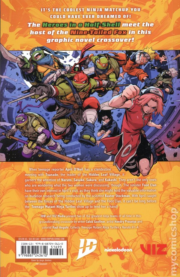 Written by Caleb Goellner. Art by Hendry Prasetya. Cover by Jorge Jiménez. IDW and VIZ Media present the shinobi showdown of your dreams in this action-packed crossover finale!The Teenage Mutant Ninja Turtles and Team Seven have defeated the Foot Clans mutated forces, but the battle is far from over: Using the power of the ooze, Oroku Saki has abandoned his humanity and transformed himself into the monstrous Shredder. As he seeks revenge against Big Apple Village, its up to our heroes to end Shredders path of destruction and challenge the cycle of hatred consuming him. The fight youve been waiting for is finally here—Naruto vs. Shredder! 32 pages, full color. Cover price $4.99.