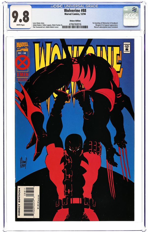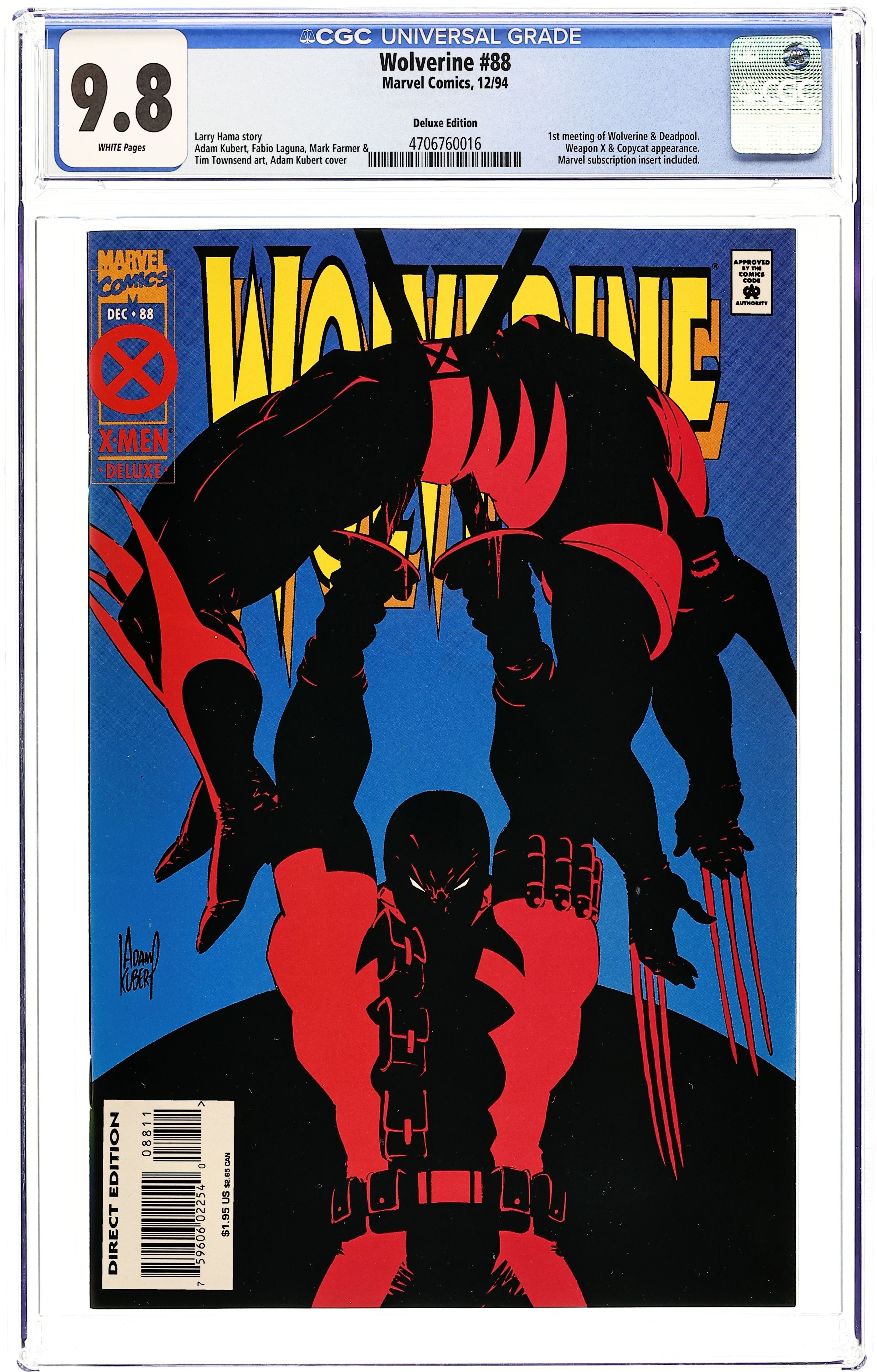 Deluxe Direct edition. Cover art by Adam Kubert. It's D-D-Deadpool, Folks!, script by Larry Hama, pencils by Adam Kubert and Fabio Laguna, inks by Mark Farmer and Tim Townsend; Wolvie stops in to check on Kane and ends up battling Deadpool instead. 36 pgs. $1.95. Cover price $1.95.