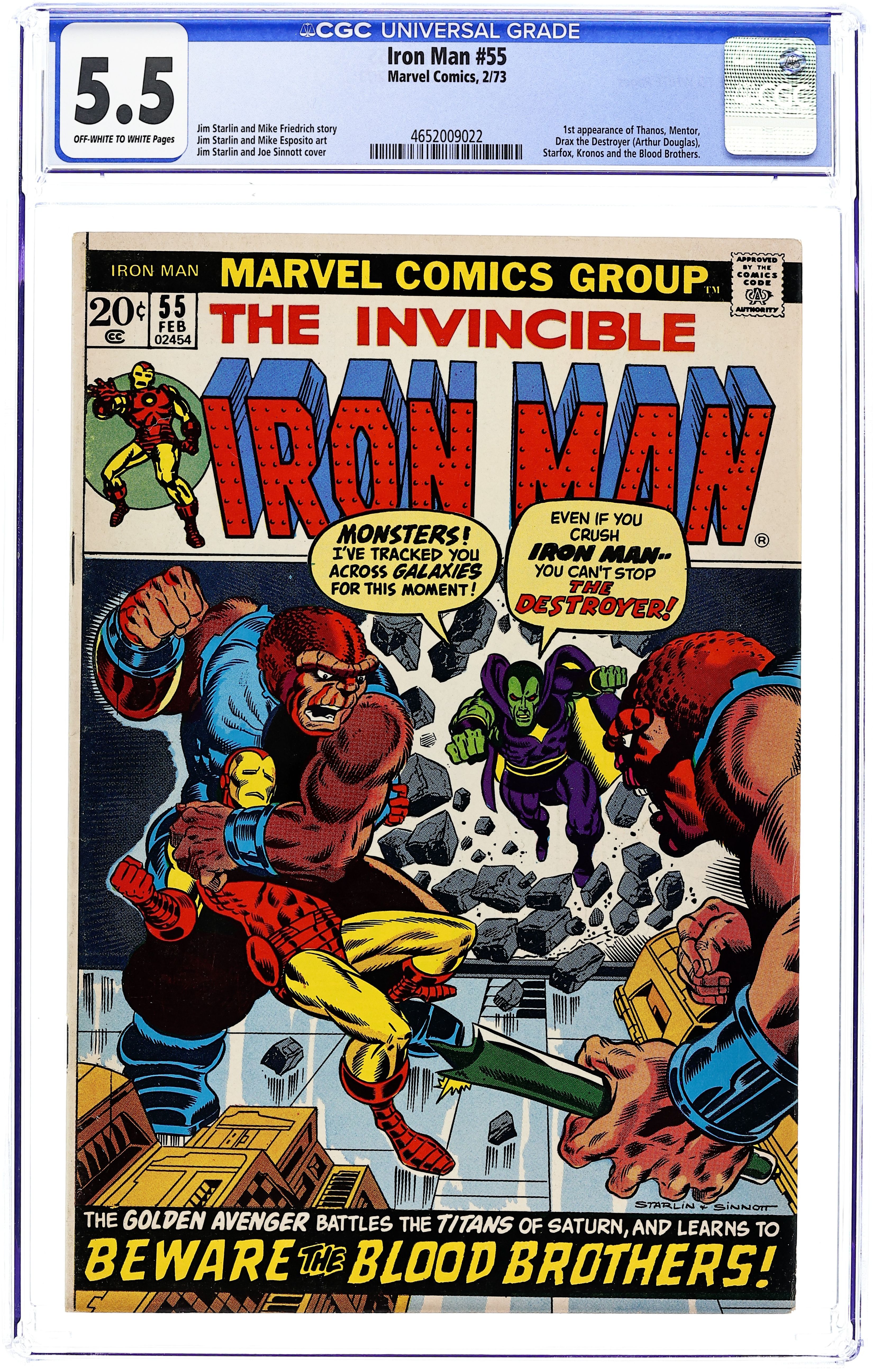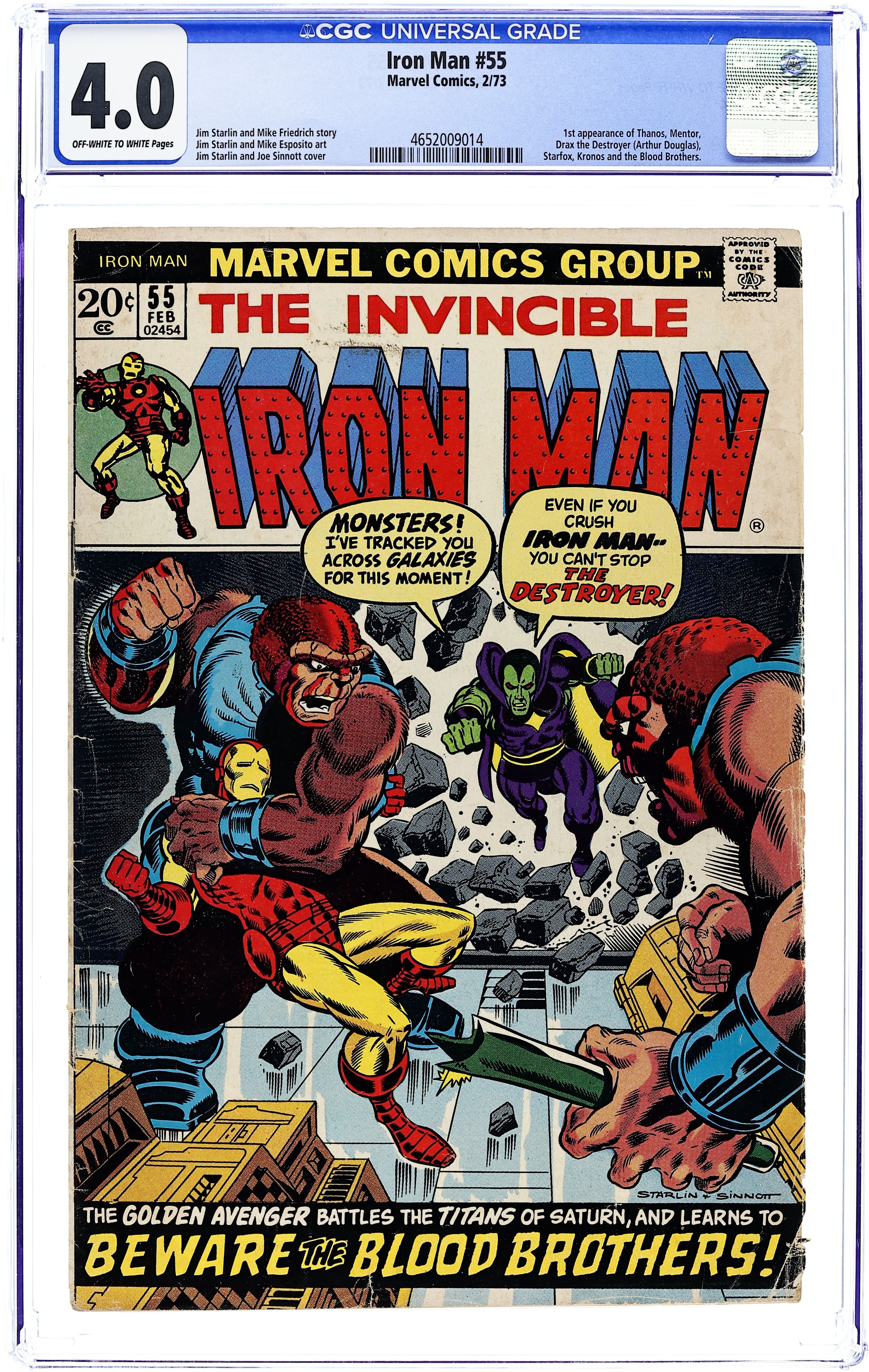 Starts Apr 4 "Beware the Blood Brothers!" First appearance of Thanos. Story by Jim Starlin. Art by Jim Starlin and Mike Esposito. Cover by Jim Starlin and Joe Sinnott. One of the landmark Marvel issues of the Bronze Age. Drax the Destroyer is a prisoner of Thanos at the evil Titan's Earth-fortress. In an effort to escape, Drax telepathically reaches out to Tony Stark for assistance; but before Iron Man can come to the rescue, Shell-Head is ambushed by the Blood Brothers! Can Drax and the golden avenger defeat the Blood Brothers and Thanos? Also first appearances of Drax the Destroyer, Starfox (in a flashback), and Mentor. (Note: Iron Man 55 was reprinted as a Marvel Milestone Edition in 1992.) 36 pages Cover price $0.20.