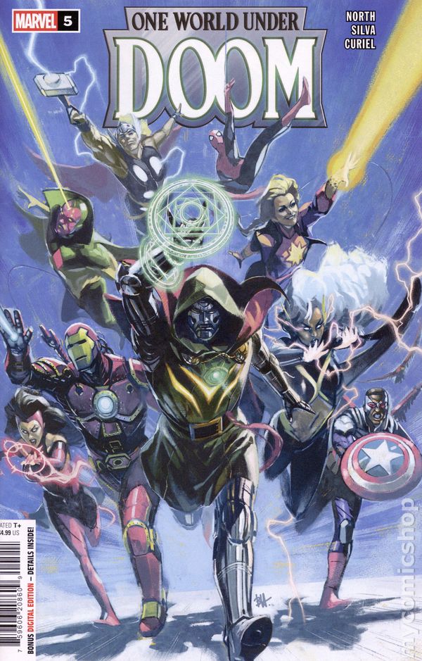 (W) Ryan North (A) R.B. Silva (CA) Ben Harvey FINALE! Doom has confronted all of Earth's heroes in battle - and he's won. What's more, he's used the magical power of Sorcerer Supreme to ensure that this victory has become a fixed moment in time: a thing that will stand forever, impervious to magic or time travel alike. But unbeknownst to Doom, in that climatic moment that can now never be changed, the seeds of Doom's downfall were also fixed for all eternity. Left with an intolerable defeat that cannot be changed, Doom makes a choice he can never undo - and the rest of the world will pay his price... ...it all comes down to this in the big finale of ONE WORLD UNDER DOOM! PLUS: If the Sorcerer Supreme falls, who will rise to take his place? Find out here! 32 pages, full color, rated T. Cover price $4.99.