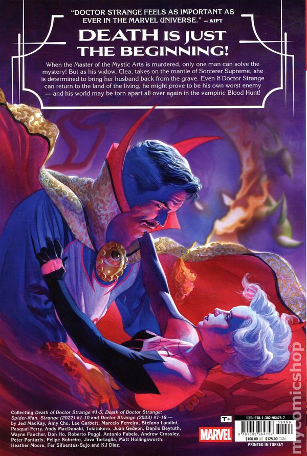 1st printing. Collects The Death of Doctor Strange (2021 Marvel) #1-5, The Death of Doctor Strange: Spider-Man (2021 Marvel), Strange (2022 Marvel) #1-10, and Doctor Strange (2023 Marvel) #1-18. Written by Jed MacKay, Amy Chu, and Jonathan Hickman. Art by Lee Garbett, Marcelo Ferreira, Wayne Faucher, Don Ho, Roberto Poggi, Stefano Landini , Pasqual Ferry, Tokitokoro, Andy MacDonald, Juan Gedeon, and Danilo Beyruth. Cover by Alex Ross. DEATH IS JUST THE BEGINNING FOR JED MACKAY'S MAGICAL RUN! When Stephen Strange is murdered, his friends mourn, his enemies rage at having been deprived of the killing blow and dark forces set their sights on an unprotected Earth. As the planet's remaining magicians race to protect our world, one very surprising investigator must unravel the mystery of Doctor Strange's murder. But can he do it before his own time runs out? In the aftermath, Earth needs a new Sorcerer Supreme - and Clea Strange is the ideal candidate! But as Clea faces threats including the Harvestman, the Shadow Knight and her own mother, Umar, she remains determined to find a way to bring her husband back to life. But even if Doctor Strange can return, his own greatest enemy may well be...himself! Guest-starring the new Secret Defenders! Hardcover, 8 1/2-in. x 11-in., 864 pages, full color. Rated T+ Cover price $100.00.