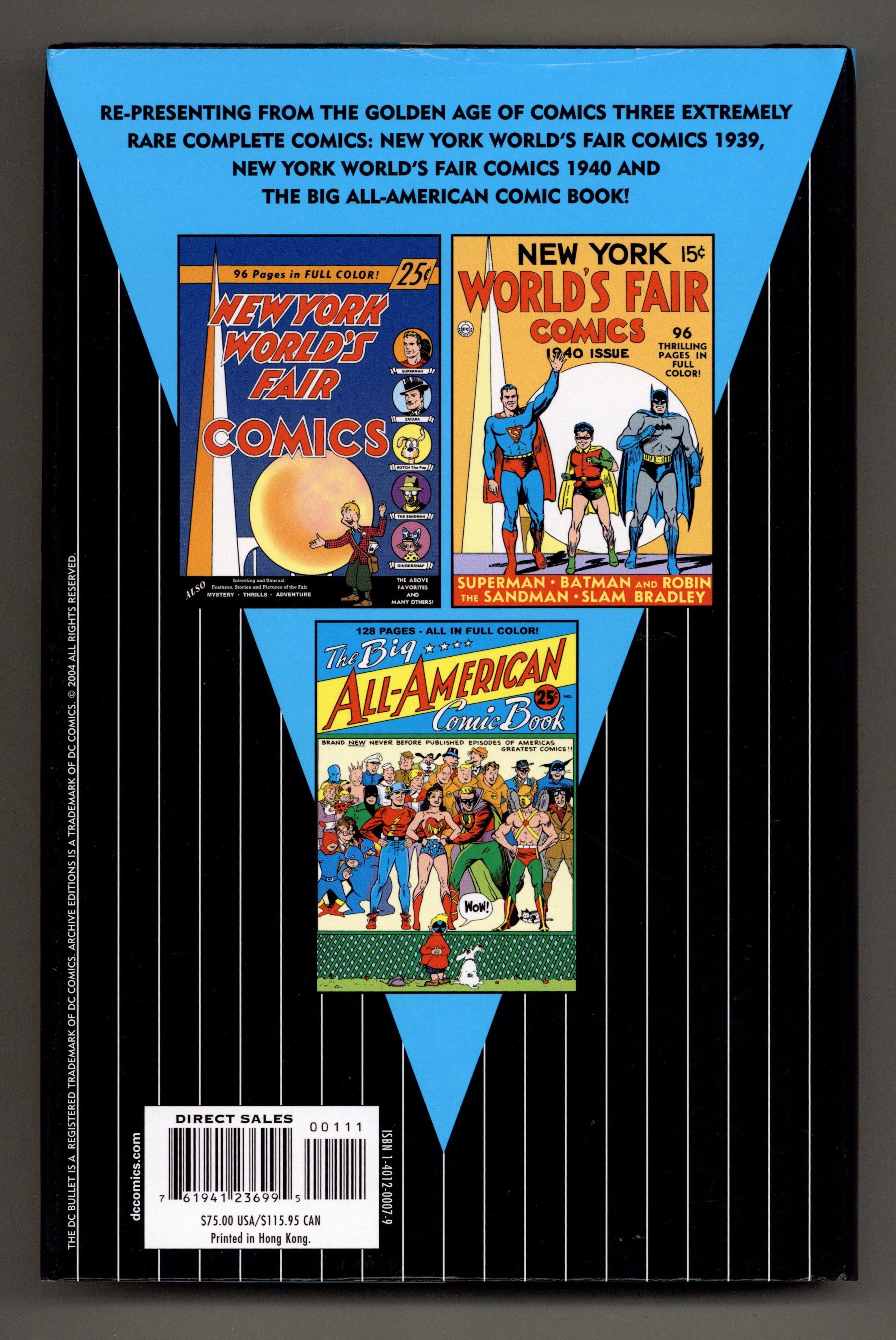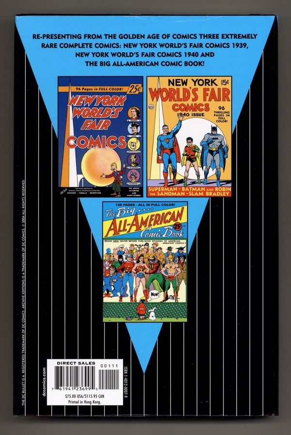 Starts May 4 Volume 1 - 1st printing. Collects NEW YORK WORLD'S FAIR 1939, NEW YORK WORLD'S FAIR 1940 and BIG ALL-AMERICAN COMIC BOOK #1 (1944). Written by Jerry Siegel, Gardner Fox, Sheldon Mayer, William Marston, and Bob Kane. Art by Joe Shuster, Bob Kane, Harry G. Peter, Jack Burnley, Shelly Moldoff, and Creig Flessel. Cover by Sheldon Mayer, Howard Purcell, and E. E. Hibbard. This volume, with an introduction by Roy Thomas, features appearances by virtually every early Golden Age DC hero: Superman, Batman, Wonder Woman, the Flash, Sandman, Hawkman, Scribbly, The Atom, Green Lantern, Mr. Terrific, Jonny Thunder and Wildcat! Plus, loads of backups, funny animals, gag strips, text pieces and information about the Fair! This is truly a testament to the diversity of the Golden Age of DC Comics that no serious comics collector should be without. Hardcover, 348 pg, full color. Cover price $75.00.
