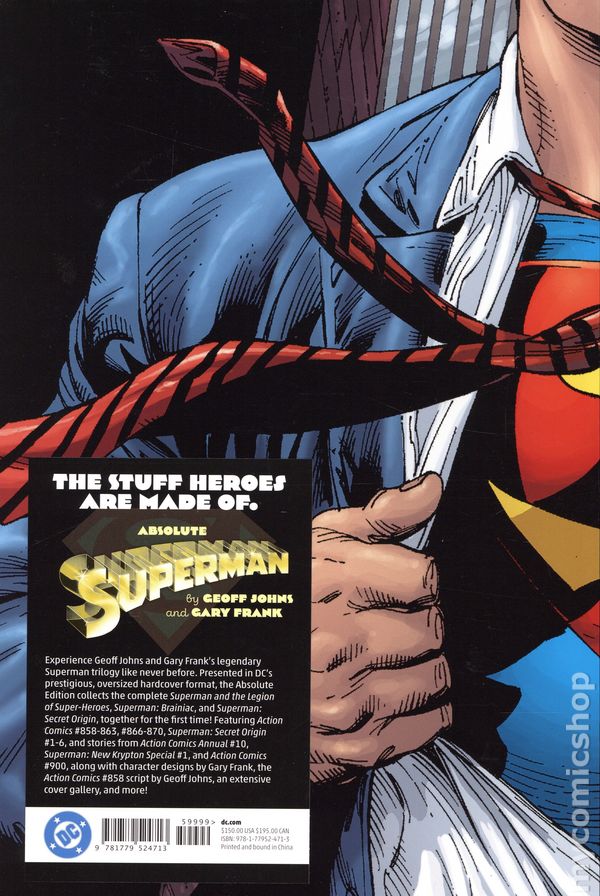 2nd and later printings. Collects Action Comics (1938-2011 DC) #858-863 and 866-870; Superman: Secret Origin (2009) #1-6; and stories from Action Comics (1938-2011 DC) Annual #10, Superman: New Krypton Special (2008) #1, and Action Comics (1938-2011 DC) #900. Written by Geoff Johns and Richard Donner. Art by Gary Frank, Jonathan Sibal, and Bit. Cover by Gary Frank. Experience Geoff Johns and Gary Frank's legendary Superman trilogy like never before. Presented in DC's prestigious oversize hardcover format, the Absolute Edition collects the complete Superman and the Legion of Super-Heroes, Superman: Brainiac, and Superman: Secret Origin, together for the first time! Featuring ACTION COMICS #858-863 and #866-870; SUPERMAN: SECRET ORIGIN #1-6; and stories from ACTION COMICS ANNUAL #10, SUPERMAN: NEW KRYPTON SPECIAL #1, and ACTION COMICS #900, along with character designs by Gary Frank, a script by Geoff Johns, an extensive cover gallery, a brand-new double-spread slipcase cover by Gary Frank, never-before-seen pencils, and more! Hardcover, 9 1/2-in. x 13-in., 640 pages, full color. Cover price $150.00.