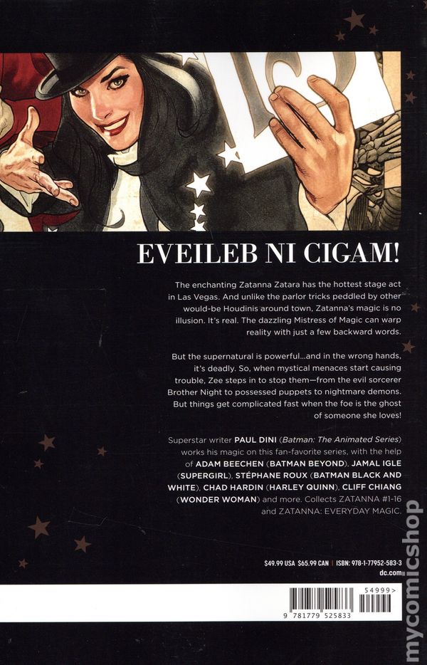 2nd and later printings. Collects Zatanna (2010 2nd Series) #1-16, Zatanna: Everyday Magic (2003) and material from Infinite Halloween Special (2007) and DC Rebirth Holiday Special (2016).