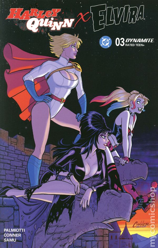 Limited 1 for 20 Retailer Incentive Variant Cover.(W) Amanda Conner, Jimmy Palmiotti (A) Juan Samu, Amanda Conner (CA) Amanda Conner NEXT STOP: TRANSYLVANIA! Harley Quinn’s plan to throw a borough-wide Halloween party in Brooklyn to save Elvira’s cancelled TV show is shaping up nicely — and by “nicely,” of course we mean “total chaos!” Facing a distinct lack of legitimate investors on this side of the Atlantic, Harley and her reluctant partner in crime have to broaden their appeals. That means courting Old World money — and money doesn’t get much older than the mouldering family fortunes found in certain European crypts! Shameless Harley Quinn enablers AMANDA CONNER and JIMMY PALMIOTTI raise the stakes in their third issue of HARLEY QUINN X ELVIRA, with Conner continuing to deliver double-barreled cover action — together with JOSEPH MICHAEL LINSNER, CHAD HARDIN, and BEN CALDWELL — as well as supplementing JUAN SAMU’s inimitable interior art! Cover price $4.99.