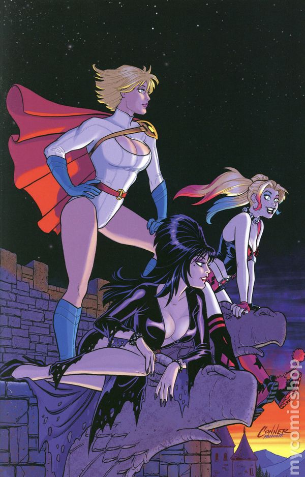 Limited 1 for 10 Retailer Incentive Variant Cover.(W) Amanda Conner, Jimmy Palmiotti (A) Amanda Connor, Juan Samu (CA) Joseph Michael Linsner When Elvira first met Harley Quinn, the Mistress of the Dark was desperate for any plan that could help her save her beloved TV show after it was threatened with cancellation by heartless corporate raiders. Well, the Clown Princess of Crime came up with a plan, all right, and now Elvira is along for the ride no matter how crazy Harley's scheme turns out to be! Putting together the biggest Halloween block party ever staged is a great idea in theory, but pulling it off means raising a massive amount of money and a pile of cash that big is sure to draw the attention of every thug and delinquent in the Tri-State area. If Harley and Elvira want to keep their party funds secure, they're going to have to become too big to fail and that means going international! 32 pages, full color, rated teen+. Cover price $4.99.