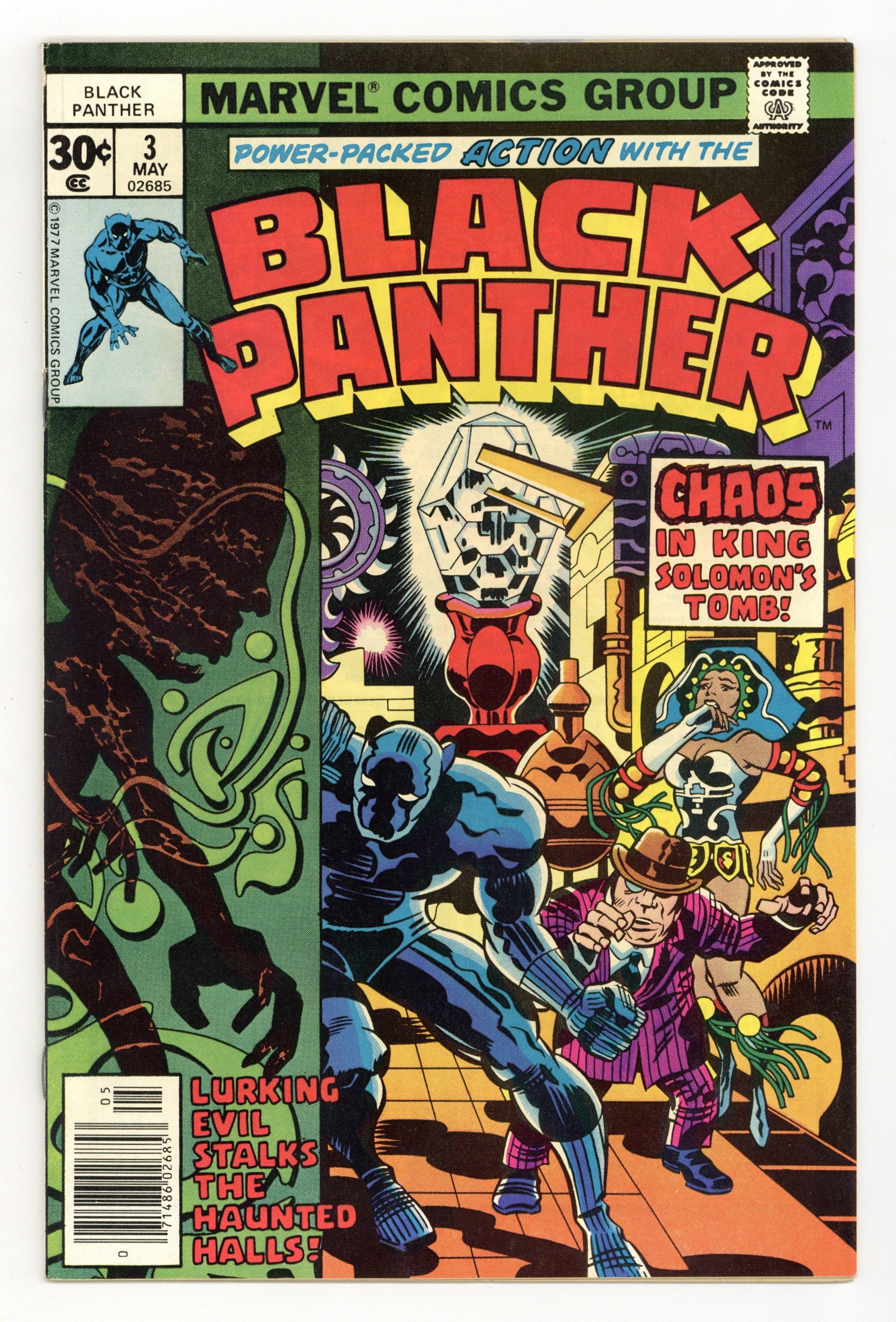 Starts Mar 2 Cover pencils by Jack Kirby, inks by John Verpoorten. King Solomon's Frog!, script and pencils by Jack Kirby, inks by Mike Royer; Black Panther helps Abner Little, a member of the Collectors, recover the Brass Frog, an ancient time machine; Due to its dangerous nature, the Frog had previously been hidden away by the Black Panther's grandfather, Azzuri, but was taken by Alfred Queely, a fellow member of the Collectors; After getting the Frog, the Black Panther and Little are attacked by Princess Zanda, another member of the Collectors, for control of the artifact. During the battle, the Frog is activated and a mysterious creature, Hatch-22, appears. Jack Kirby writes about what readers can expect from his new Black Panther. 36 pgs. $0.30. Cover price $0.30.