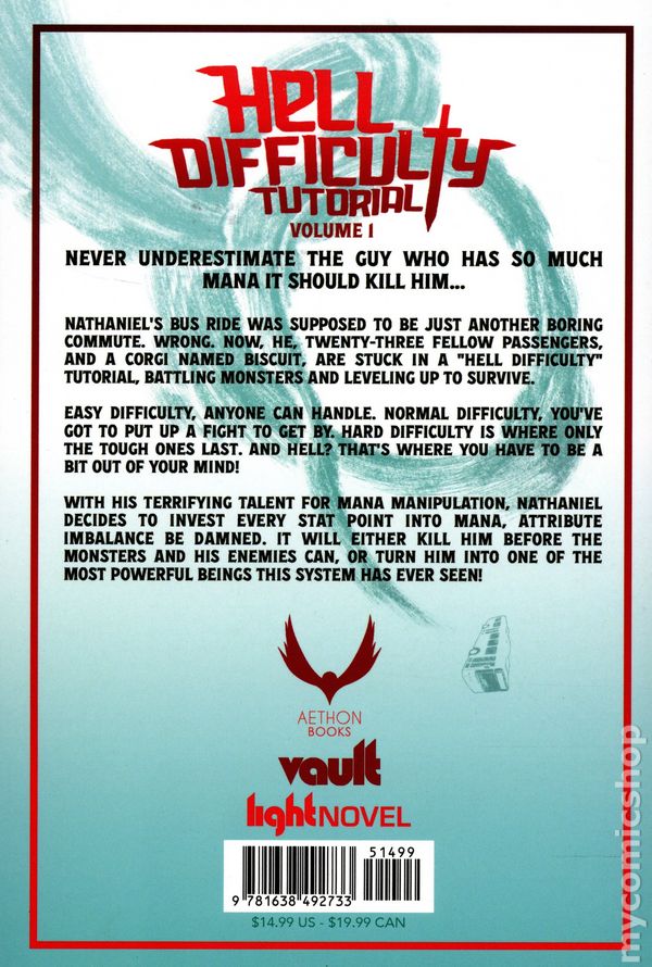 Volume 1 - 1st printing. Written by Cerim. Art and cover by Karassawa. Where others see doom, he sees opportunity. Hell Difficulty? More like a chance to thrive. Nathaniel's bus ride was supposed to be just another boring commute. Wrong. Now, he, 23 fellow passengers, and a corgi named Biscuit, are stuck in a "Hell Difficulty" Tutorial, battling monsters and leveling up to survive. Easy difficulty, anyone can handle. Normal difficulty, you've got to put up a fight to get by. Hard difficulty is where only the tough ones last. And Hell? That's where you have to be a bit out of your mind! Softcover, 5 1/4-in.x 8 1/4-in., 256 pages, Text (with B&W Chapter Illustrations). Teen+ Cover price $14.99.