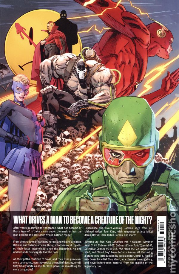 Volume 1 - 1st printing. Collects Batman Rebirth (2016) and Batman (2016 3rd Series) #1-20, Detective Comics (2016 3rd Series) #941-942, Nightwing (2016 DC) #5-6, and Batman/Elmer Fudd Special (2017 DC). Written by Tom King, Steve Orlando, Tim Seeley, James Tynion IV, and Scott Snyder. Art by David Finch, Mikel Janinh, Mitch Gerads, Andy MacDonald, Riley Rossmo, Lee Weeks, Roge Antonia, Ivan Reis, Byron Vaughns, Danny Miki, Sandra Hope, Hugo Petrus, Scott Hanna, Oclair Albert, Joe Prada, and Trevor Scott. Cover by Mikel Janin. Back Cover by Stephanie Hans. Who is Batman? What becomes of Bruce Wayne after years spent in service of vengeance? What drives a man to become a creature of the night? Is there still a man under the mask, or has the man become the costume? With Catwoman, the Flash, and the Bat-Family at his side, discover the groundbreaking stories that launched a saga! Softcover, 600 pages, full color. Teen Cover price $49.99.