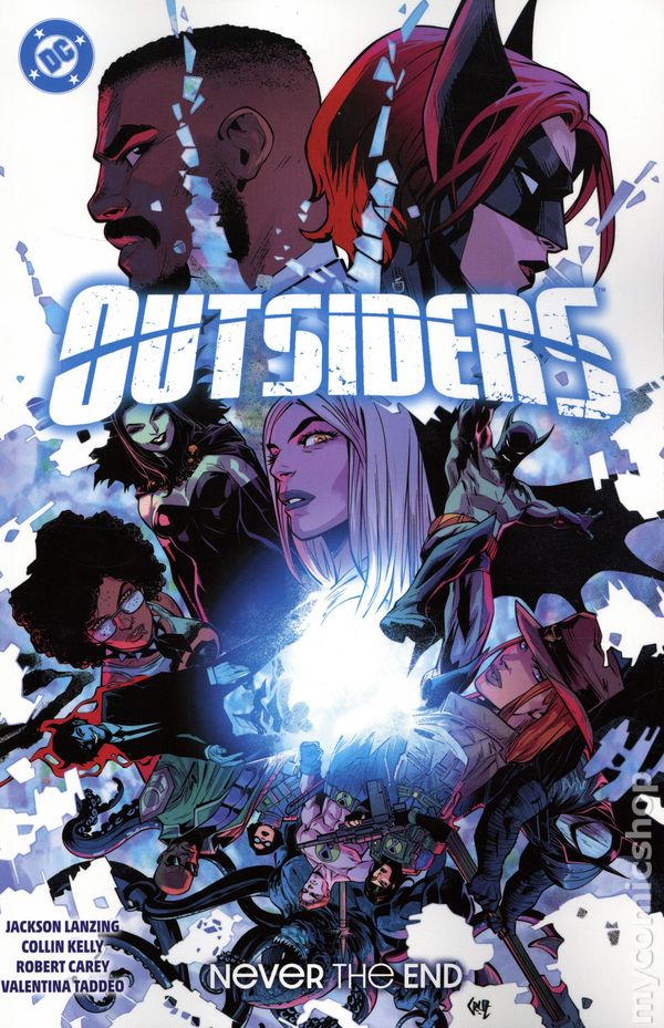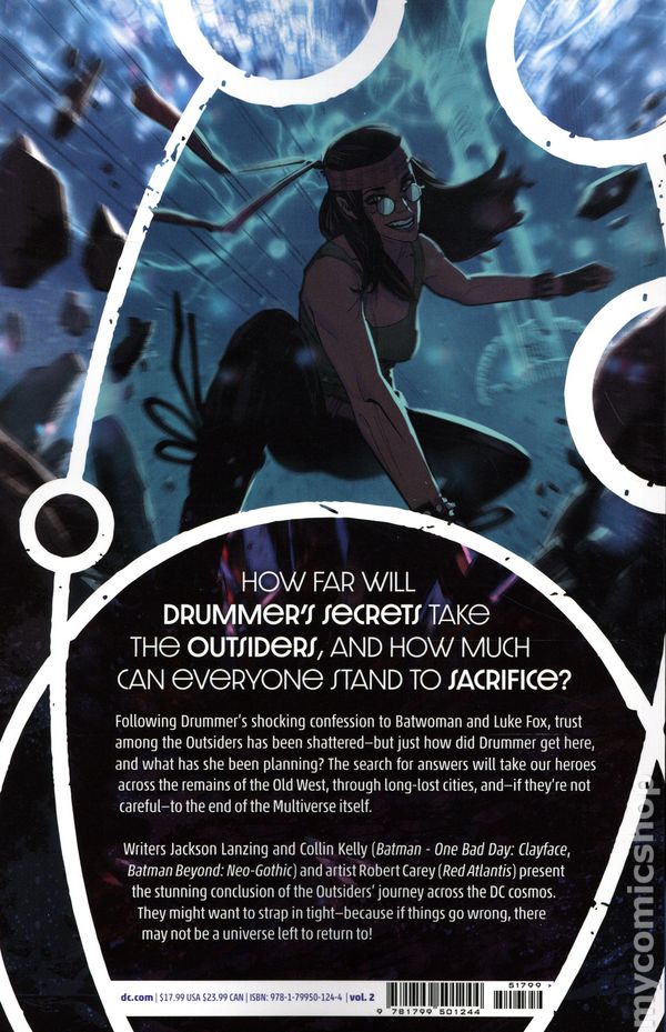 1st printing. Collects Outsiders (2023 DC) #7-11. Written by Jackson Lanzing and Collin Kelly. Art by Robert Carey. Cover by Roger Cruz. Back over by Robert Carey. Writers Jackson Lanzing and Collin Kelly (Batman: One Bad Day: Clayface, Batman Beyond: Neo-Gothic) and artist Robert Carey (Red Atlantis) present the stunning conclusion of Batwing, Batwoman, and Drummer's journey across the DC cosmos. They might want to strap in tight--because if they're not careful, there may not be a universe left to return to! Softcover, 160 pages, full color. Teen Cover price $17.99.