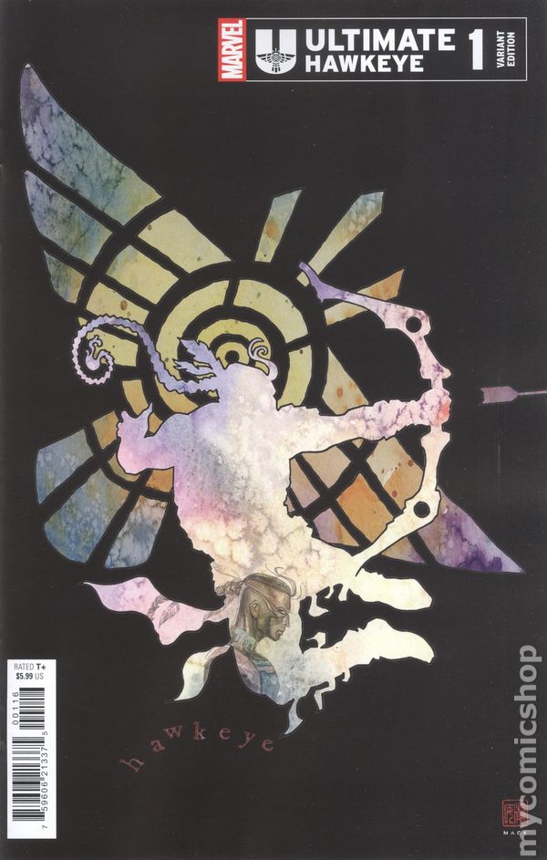 Limited 1 for 25 Retailer Incentive Variant Cover. Written by Deniz Camp. Art by Juan Frigeri. Cover by David Mack. ULTIMATE HAWKEYE STARS IN THEIR OWN SOLO ADVENTURE! Spinning out of THE ULTIMATES, breakout hit character HAWKEYE goes on a covert solo op that will have a massive impact on the future of the Ultimate Universe! 32 pgs, FC, T+ Cover price $5.99.
