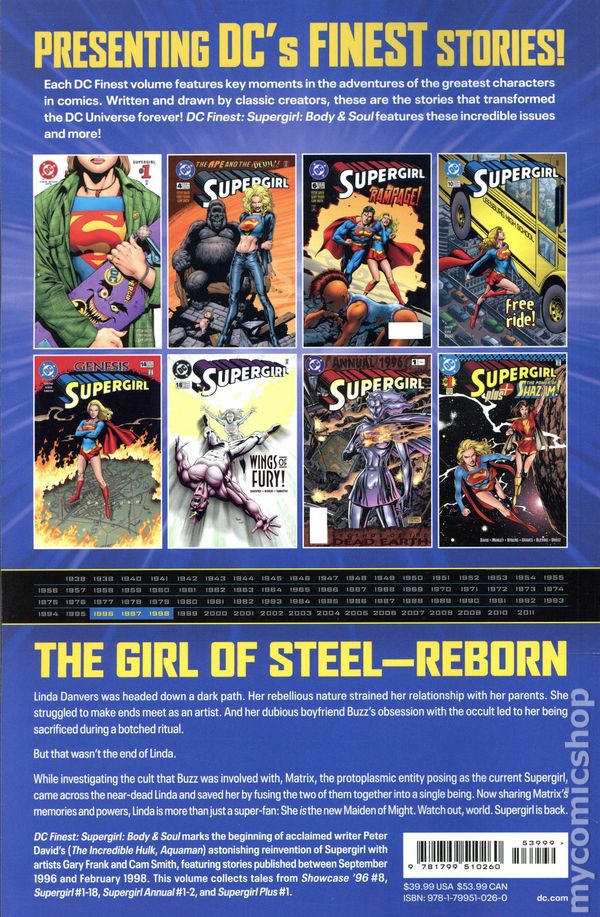 1st printing. Collects Stories from Showcase 96 (1996) #8, Supergirl (1996-20033rd Series) #1-18, Supergirl (1996-20033rd Series) Annual #1-2, and Supergirl Plus (1997). Written by Peter David, Gary Frank, Darren Vincenzo, Joe Lansdale, Neal Barrett, Jr., Tom Peyer and Chuck Dixon. Art by Gary Frank, Cam Smith, Leonard Kirk, Chuck Drost, Greg Land, Prentis Rollins, Robert Teranishi, Stan Woch, Anthony Castrillo, Jordi Ensign, Mike Manley, Bret Blevins, and John Nyberg. Cover by Gary Frank and Cam Smith. THE GIRL OF STEEL--REBORN! Art by Gary Frank, Leonard Kirk, Cam Smith and Others DC Finest: Supergirl: Body & Soul marks the beginning of acclaimed writer Peter David's (The Incredible Hulk, Aquaman) astonishing reinvention of Supergirl with artists Gary Frank and Cam Smith, featuring stories published between September 1996 and February 1998. Softcover, 568 pages, full color. Teen Cover price $39.99.