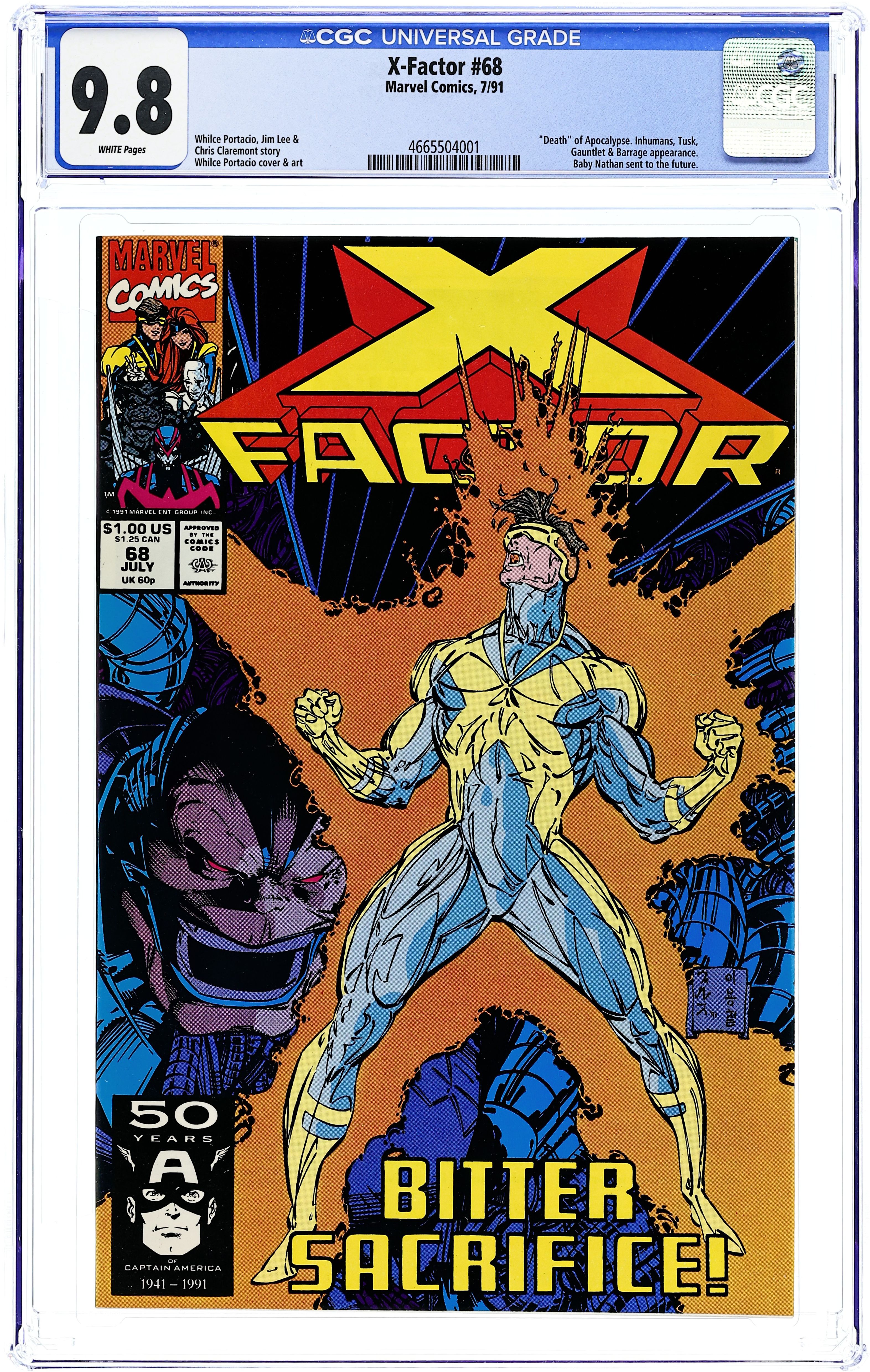 Endgame! Part 4 of 4. "Finale!" Guest-starring the Inhumans. Cameo by the Watcher. Story by Whilce Portacio, Jim Lee, and Chris Claremont. Art by Whilce Portacio and Art Thibert. In a world ruled by Apocalypse only the strong survive. If X-Factor can't stop the power hungry mutant here and now, that's exactly the kind of place this world will become. But first they'll have to get past the Riders of the Storm and the brainwashed Inhumans. Plus, in order to save the world and the life of his infant son, Cyclops must make the ultimate sacrifice. NOTE: This is a pivotal issue. This is when Nathan Summers, as a baby, is sent into the future where he'll eventually grow-up to become the freedom fighter known as Cable. Cover price $1.00.