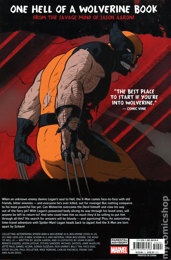 2nd Edition - 1st printing. Collects Astonishing Spider-Man and Wolverine (2010) #1-6; Wolverine (2010-2013 3rd Series) #1-20, #5.1 and #300-304; X-Men Schism (2011 Marvel) #1-5; and material from Wolverine: Road to Hell (2010). Written by Jason Aaron. Art by Adam Kubert, Mark Morales, Dexter Vines, Renato Guedes, Jose Wilson Magalhaes, Oclair Albert, Jason Latour, Steve Sanders, Michael Gaydos, Jamie McKelvie, Danial Acuna, Jefte Palo, Goran Sudzuka, Carlos Pacheco, Cam Smith, Frank Cho, Daniel Acuna, Alan Davis, Mark Farmer, Adam Kubert, Mark Roslan, Ron Garney, Steven Sanders, Billy Tan, Paco Diaz, Steve Dillon, Paul Pelletier, Dave Meikis, and Mike Perkins. Cover by Jae Lee. Back Cover by Paolo Rivera. Jason Aaron puts Wolverine through Hell - literally! A mysterious organization conspires to possess Wolverine's body with demons, and send his soul to the underworld! Waiting for Logan are the souls of unexpected family and friends - and the Devil himself! Naturally, Wolverine plans to claw his way back out and have his revenge - but that might be exactly what the shadowy group wants! Will the final twist in its plan shatter Wolverine completely? Plus: Wolverine and Spider-Man must survive a trip through time without killing each other, Wolverine faces Cyclops in a schism over the future of the X-Men, and Logan returns to Japan to prevent an underworld takeover by his oldest foe! Hardcover, 8-in. x 11-in., 984 pages, full color. Parental Advisory Cover price $125.00.