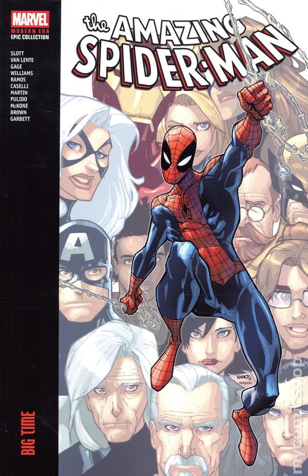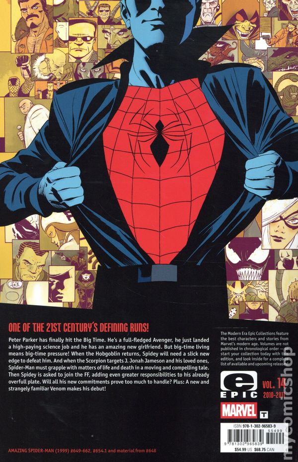 1st printing. Collects The Amazing Spider-Man (1998-2013 2nd Series) #648 (A story), 649-662, and 654.1. Written by Dan Slott, Fred Van Lente, Rob Williams, Christos Gage, and Frank Tieri. Art by Humberto Ramos, Carlos Cuevas, Joseph M. Damon, Victor Olazaba, Neil Edwards, Scott Hanna, Stefano Caselli, Paulo Siqueira, Ronan Cliquet, Roland Paris, Greg Adams, Marcos Martin, Ty Templeton, Nuno Plati, Javier Pilido, Mike McKone, Reilly Brown, Javier Rodriguez, Lee Garbett, and Alejandro Sicat. Cover by Humberto Ramos. Back Cover by Marcos Martin. One of the most pivotal eras of Spider-Man storytelling begins here, as revered Spider-Man writer Dan Slott commences his years-long tenure on the wall-crawler! Peter Parker has finally hit the Big Time. Hes a full-fledged Avenger, he just landed a high-paying science job and he has an amazing new girlfriend. But big-time living means big-time pressure! When the Hobgoblin returns, Spidey will need a slick new edge to defeat him. And when the Scorpion targets J. Jonah Jameson and his loved ones, Spider-Man must grapple with matters of life and death in a moving and compelling tale. Then Spidey is asked to join the FF, adding even greater responsibilities to his already overfull plate. Will all his new commitments prove too much to handle? Plus: A new and strangely familiar Venom makes his debut! Softcover, 512 pages, full color. Rated T Cover price $54.99.