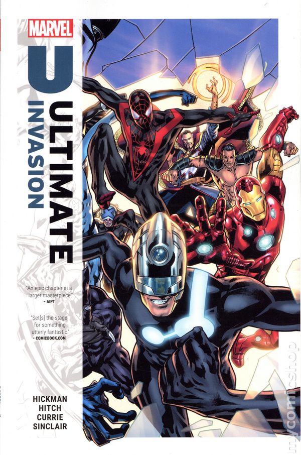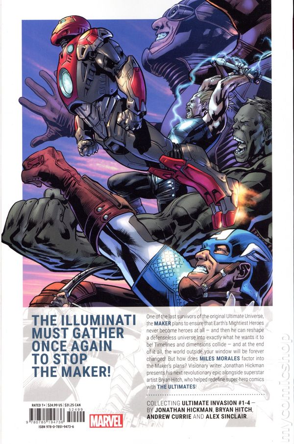 2nd and later printings. Collects Ultimate Invasion (2023 Marvel) #1-4. Written by Jonathan Hickman. Art and cover by Bryan Hitch and Andrew Currie. The Illuminati must gather once again to stop the Maker! One of the last survivors of the original Ultimate Universe, the Maker plans to ensure that Earth's Mightiest Heroes never become heroes at all - and then he can reshape a defenseless universe into exactly what he wants it to be! Timelines and dimensions collide - and at the end of it all, the world outside your window will be forever changed! But how does Miles Morales factor into the Maker's plans? Fresh from masterminding the Krakoan era of X-Men, visionary writer Jonathan Hickman presents his next revolutionary epic alongside superstar artist Bryan Hitch, who helped redefine super-hero comics with THE ULTIMATES! Softcover, 192 pages, full color. Rated T+ Cover price $24.99.