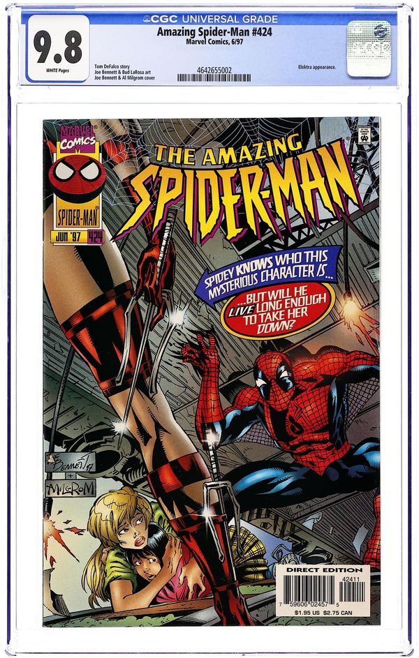 Last $1.95 cover price. Cover pencils by Joe Bennett, inks by Al Milgrom. "Then Came... Elektra," script by Tom DeFalco, pencils by Joe Bennett, inks by Ralph Cabrera and Bud LaRosa; Elektra battles the Hand to learn why they have returned to New York, learning they plan to deal with their hereditary blood enemies, the True Believers; Spidey is still plagued by debilitating headaches while, at the Daily Bugle, JJJ realizes their True Believers expose could endanger the entire Bugle staff; Elsewhere, Madame Qwa orders Dragonfly to kill her cousin Angela to atone for failing to kill Robbie, putting Yano on Dragonfly's trail. Elektra allies with the Rose against the True Believers; Dragonfly cannot bring herself to kill Angela; The Rose's street operatives inform Elektra and Spidey that the Believers are at the West Side train yards, where Yano prepares to kill Dragonfly for her latest failure; At the Bugle, a frightened JJJ plans to leave town; Spidey and Elektra join Dragonfly to defeat the True Believers. 44 pgs., full color. $1.95. Cover price $1.95.