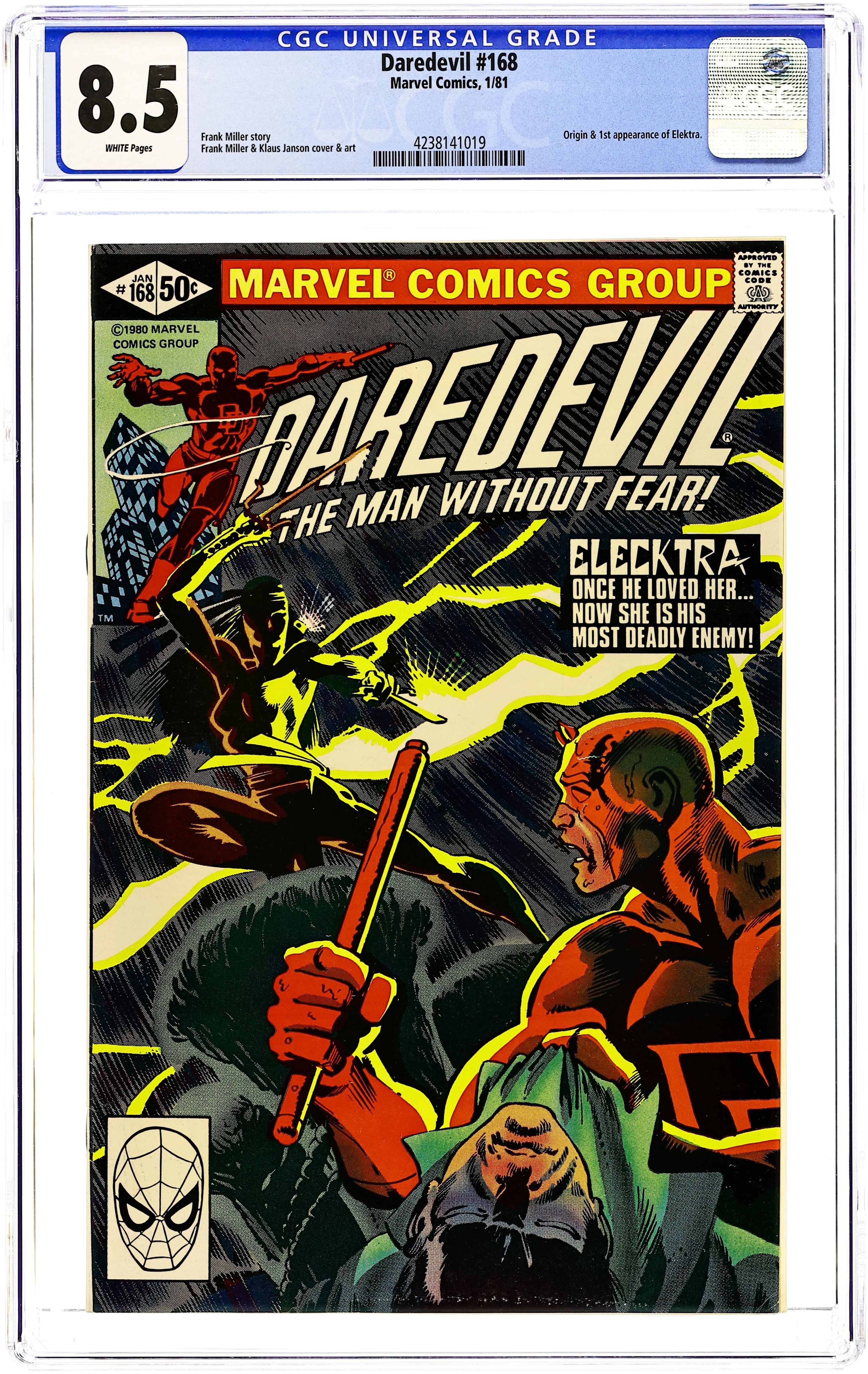Direct Edition. Cover pencils by Frank Miller, inks by Klaus Janson. First appearance of Elektra in Elektra, script by Frank Miller, pencils by Frank Miller (breakdowns) and Klaus Janson (finished art), inks by Klaus Janson; Matt is after an international criminal being protected by Eric Slaughter when he runs across his college sweetheart turned bounty hunter; this story, by the way, is a reworking of a couple of classic Spirit stories by Will Eisner, Sand Serif and Bring in Sand Serif (1950). 36 pgs. Cover price $0.50. Cover price $0.50.
