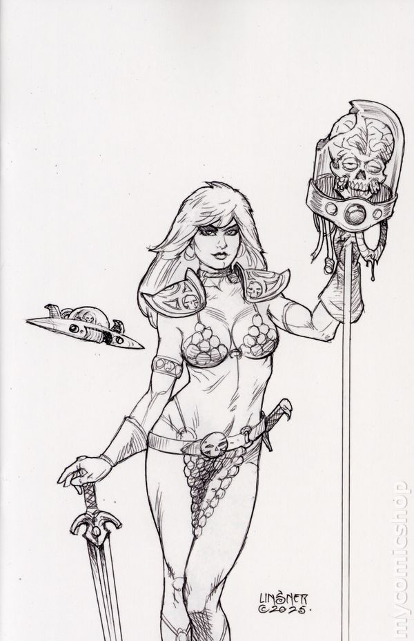 Limited 1 for 20 Retailer Incentive Variant Cover. Written by Jay Stephens. Art by Fran Strukan. Cover by Joseph Michael Linsner. JOURNEY TO INNER SPACE! With time running out before her world is overwhelmed by skull-faced fiends from beyond the Moon, Sonja and her crew sail north across the Villayet Sea in an all-out effort to strike at the main force of alien invaders while they slumber in their subterranean stronghold. But before they can even descend into those horror-filled catacombs, the She-Devil and her companions must first survive a night of terror on Devil's Island - not to mention fighting their way through the dread Martian pirates known as the Red Brotherhood! The battle is joined in the thrilling third issue of Red Sonja Attacks Mars, painstakingly reported by Hyborian Age correspondents JAY STEPHENS and FRAN STRUKAN and encased in morale-boosting covers from JOSEPH MICHAEL LINSNER, JAE LEE & JUNE CHUNG, and GREG LAND! 32 pages, full color. Rated T+ Cover price $4.99.