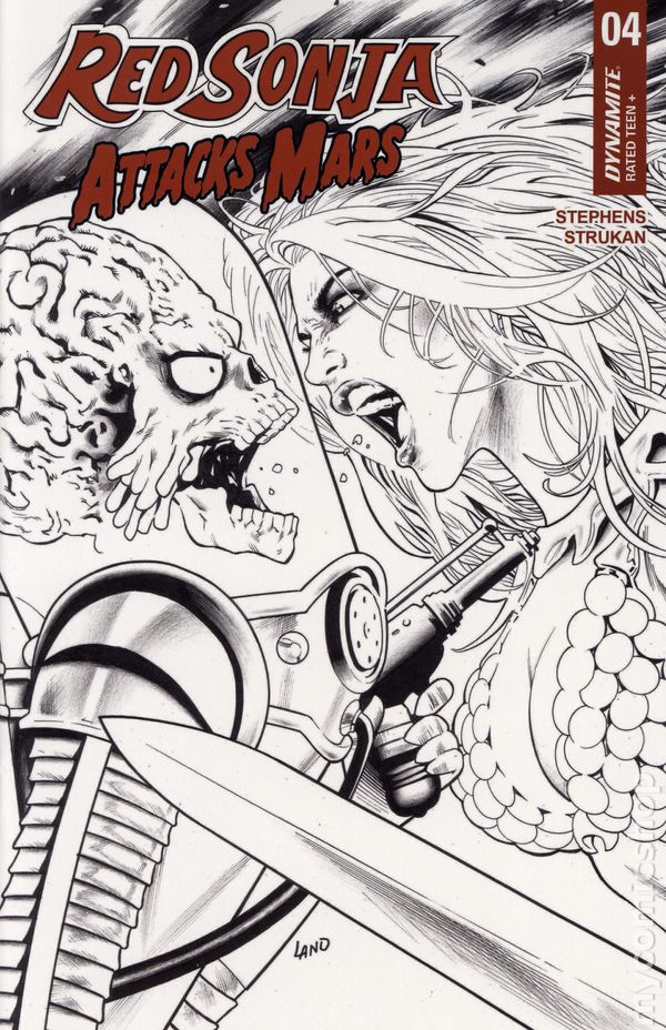 Limited 1 for 7 Retailer Incentive Variant Cover. Written by Jay Stephens. Art by Fran Strukan. Cover by Greg Land. JOURNEY TO INNER SPACE! With time running out before her world is overwhelmed by skull-faced fiends from beyond the Moon, Sonja and her crew sail north across the Villayet Sea in an all-out effort to strike at the main force of alien invaders while they slumber in their subterranean stronghold. But before they can even descend into those horror-filled catacombs, the She-Devil and her companions must first survive a night of terror on Devil's Island - not to mention fighting their way through the dread Martian pirates known as the Red Brotherhood! The battle is joined in the thrilling third issue of Red Sonja Attacks Mars, painstakingly reported by Hyborian Age correspondents JAY STEPHENS and FRAN STRUKAN and encased in morale-boosting covers from JOSEPH MICHAEL LINSNER, JAE LEE & JUNE CHUNG, and GREG LAND! 32 pages, full color. Rated T+ Cover price $4.99.