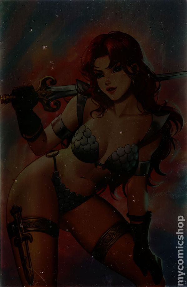 Metal Edition Virgin Cover by Lesley "Leirix" Li. Written by David Avallone. Art by Edu Menna. The crimson-maned warrior of song and legend muscles her way into trouble once more in this all-new tale of hard-boiled Hyboria! When her mercenary partner is murdered, Sonja is drawn into a feverish hunt for a priceless artifact known as the Crimson Calypso. The She-Devil with a Sword is out for revenge-but first she's got to slice her way through a web of deception and violence, waging a war of both weapons and wits against a pitiless and implacable foe. 40 pages, full color. Rated T+ Cover price $100.00.