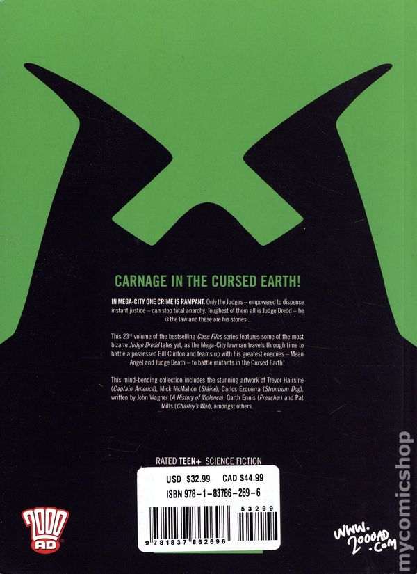 Volume 23 -2nd and later printings. Written by John Wagner and Mark Millar. Art by Carlos Ezquerra and Trevor Hairsine. Cover by Trevor Hairsine. Mega-City one: the future metropolis bustling with life and every crime imaginable. Keeping order are the Judges, a stern police force acting as judges, juries and executioners. Toughest of all is Judge Dredd. He is the law and these are his stories. Volume 23 in this best-selling series sees Judge Dredd having to team up with his two greatest foes-Judge Death and Mean Machine Angel-in order to carry out a high stakes mission in the harsh lands of the Cursed Earth. Softcover, 320 pages, PC/PB&W. Teen+ Cover price $32.99.