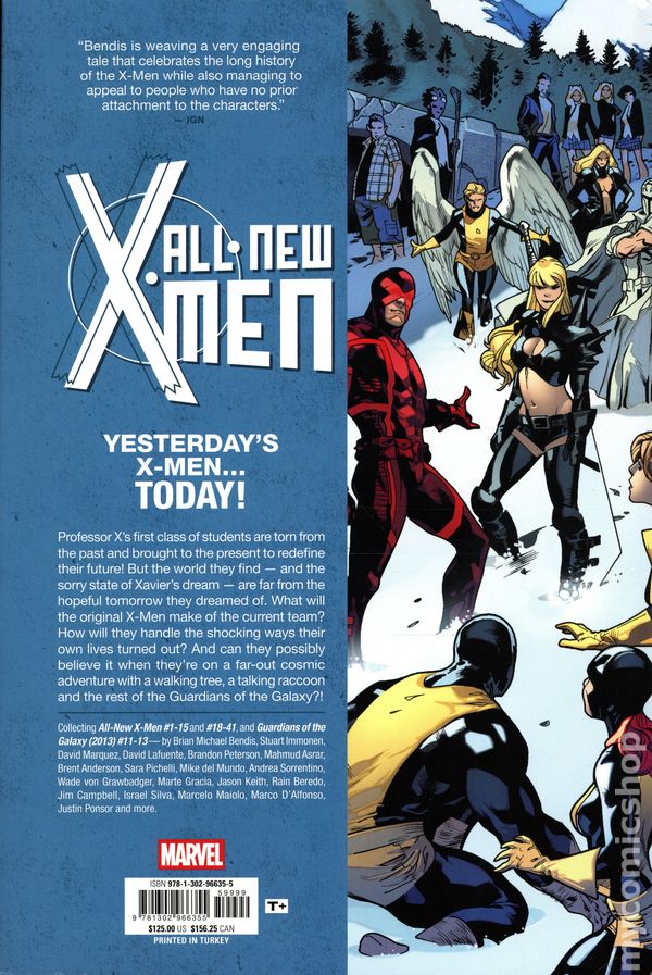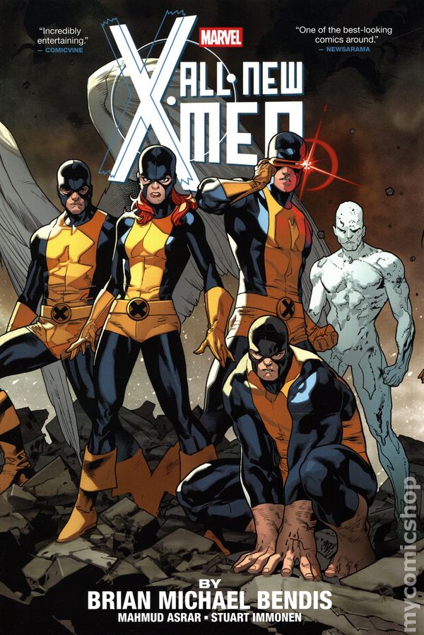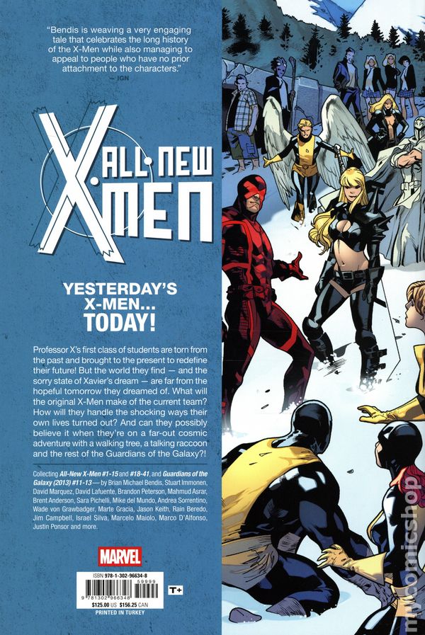 1st printing. Collects All New X-Men (2012-2015) #1-15 and 18-41 and Guardians of the Galaxy (2013-2015 3rd Series) #11-13. Written by Brian Michael Bendis. Art by Stuart Immonen, Wade von Grawbadger, Craig Yeung, David Marquez, David Lafuente, Brandon Peterson, Mahmud A. Asrar, Brent Anderson, Sara Pichelli, Bruce Timm, David Mack, Skottie Young, Robbi Rodriguez, Lee Bermejo, Kent Williams, Art Adams, J.G. Jones,m Ronnie del Carmen, J. Scott Campbell, Maris Wicks, Jason Shiga, Max Wittert, Jake Parker, Dan Hipp, Jill Thompson, Paul Smith, Jordie Bellaire, and Andrea Sorrentino. Cover by Alex Ross. Back Cover by Stuart Immonen. Superstar comic author Brian Michael Bendis collides the past and present of the X-Men in this thought-provoking and exciting era of Marvel's Mutants!Brian Michael Bendis blazes a new trail for the original X-Men! It's a blast from the past as Professor X's original five students - Cyclops, Marvel Girl, Iceman, Angel and Beast - are plucked from yesteryear and brought to the present day. But what they find - and the state of Xavier's dream - is far from the future they dreamed of. How will these young, idealistic heroes react when faced with the crushing knowledge of what fate holds for them? And how will the embittered X-Men of the present day deal with their past coming crashing forward? The time-torn teens don new costumes, face life-changing revelations and undertake their first cosmic adventure alongside the Guardians of the Galaxy! Meanwhile, the Utopians hold a secret that will change the future of mutantkind - but who are the Utopians?! The All-New X-Men may regret finding out! Hardcover, 8 1/2-in. x 11-in., 1,048 pages, full color. Rated T+ Cover price $125.00.