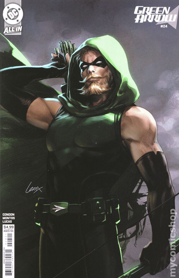 Written by Chris Condon. Art by Montos. Cover by Taurin Clarke. The Emerald Archer heads back to the streets of Star City for his next adventure with the brand-new team of Chris Condon and Montos! The cold-blooded murder of a Star City businessman announces the arrival of a horrifying and mysterious serial killer. When details of the victim's dark business dealings emerge, Green Arrow must contend with hard truths from the city's past and race to stop the murderer before they strike again. 28 pages, full color. Rated T+ Cover price $3.99.