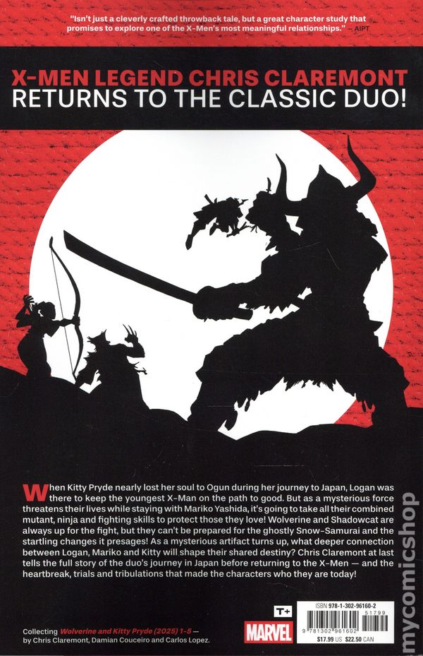 1st printing. Collects Wolverine and Kitty Pryde (2025 Marvel) #1-5. Written by Chris Claremont. Art by Damian Couceiro. Cover by Alan Davis. Industry titan Chris Claremont revisits one of his most famous classic stories starring Wolverine and Kitty Pryde of the X-Men! When Kitty Pryde nearly lost her soul to Ogun during her journey to Japan, Logan was there to keep the youngest X-Man on the path to good. But as a mysterious force threatens their lives while staying with Mariko Yashida, its going to take all their combined mutant, ninja and fighting skills to protect those they love! Wolverine and Shadowcat are always up for the fight, but they cant be prepared for the ghostly Snow Samurai and the startling changes it presages! As a mysterious artifact turns up, what deeper connection between Logan, Mariko and Kitty will shape their shared destiny? Chris Claremont at last tells the full story of the duos journey in Japan before returning to the X-Men — and the heartbreak, trials and tribulations that made the characters who they are today! Softcover, 120 pages, full color. Rated T+ Cover price $17.99.
